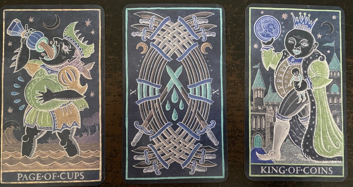 sweeneyish Posted April 6, 2022 Posted April 6, 2022 My draw for today. I continue my journey in learning more about reading pip cards and the Tarot de Marseilles. To say it's been a joyful rabbit hole would be an understatement. I'm understanding why some people love TdM decks so much. Of course, the Trionfi isn't strictly a TdM deck, but it has certainly been a gateway for me. The central card here for me is the 10 of Swords, which is framed by the Page of Cups and the King of Coins, who are each meeting the 10 of Swords in very different ways. 10 of Swords: I tried to leave the RWS meaning behind here and try a more TdM interpretation/approach. The 8 blades that are interlocking have created a barrier, but the 9th and 10th blades have managed to pierce it and are interlocked. The multiple interlocking blades point to a complex situation, and the two duelling blades could be two opposing people. As a 10, the card describes the end of a situation, and the beginning of a new one. In the domain of Swords, a conflict seems to be described, perhaps one at the intellectual and rational level. In the context of this spread, the 10 of Swords describes a situation at work I have been dealing with quite well. A new hire and I have not gotten off to a good start, and in many ways we have been duelling for the past few months. There is an opportunity right now to let the issues lay to rest and move forward on a new foot. Page of Cups: He is a little naive when it comes to his emotional journey, and looks a little engulfed by the water around him. It's nearly up to his knees, and a wave is rising up on the left hand side, threatening to overtake him. At the same time, he is guzzling a large cup of water even though his belly is full. He is turned away from the Swords, fixated on the past instead of on the present situation. I see this as one of my reactions to the conflict with my co-worker. I'm dwelling on our past interactions and drinking in all the negative emotions I felt during them, rather than engaging with the situation, as difficult as it is. King of Coins: Unlike the Page, who is turned away from the issue, the King of Coins is striding confidently towards it. He appears to offer his coin directly to the issue. He is not afraid to face the issue head-on, with a certain amount of belief in himself, but also generosity and kindness. He is solid and reliable in practical affairs. Well, good advice here for tackling the situation - head on, but with kindness, generosity, and stable even-headedness.