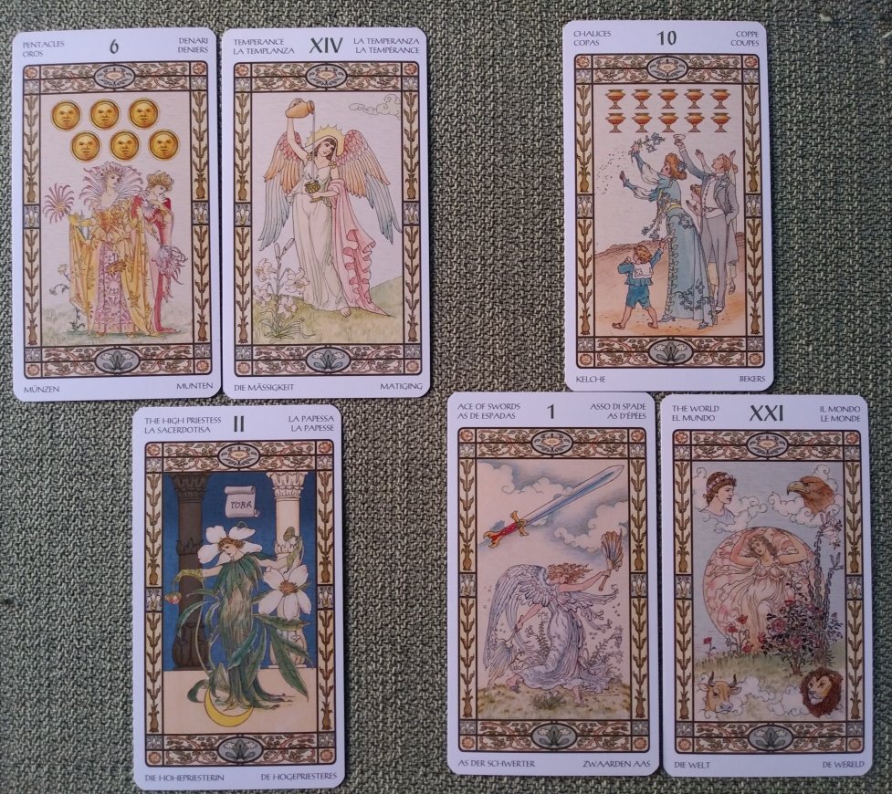 sweeneyish Posted April 3, 2022 Posted April 3, 2022 21 minutes ago, Bodhiseed said: Thank you for the new thread, @Amberjune! This week I'll be using the Gaian Tarot, a deck and book set created and self-published by Joanna Powell Colbert. I'll also be using the Goddess Oracle, a deck and book set created by Amy Sophia Marashinsky and illustrated by Hrana Janto. Today's draws are Four of Fire (Wands) and Maat: Sometimes we need our own personal celebration or ceremony, one without invitations or fanfare. Maybe it is to express a deeply felt sense of gratitude, to mark a challenge met, or to build up our courage for an event soon to come. No matter how simple in appearance, these rites can have a powerful influence on our spirit. Maat, the Egyptian personification of truth and justice, reminds us to go forward with integrity. Having principles is important, but to maintain our wholeness, we need to act from them. When we do, we'll likely find we have a reason to create another sacred circle. I am no bird; and no net ensnares me: I am a free human being with an independent will. ― Charlotte Brontë As usual, a beautiful reading, and two decks that suit each other really well. 10 minutes ago, Rachelcat said: Happy to see everyone here! This week, I’m going with one of the decks I posted in the spring deck thread, Harmonious Tarot. Time for uncomplicated, flowery readings! It’s a Lo Scarabeo deck using flower fairy illustrations by Walter Crane and Earnest Fitzpatrick. The lwb gives a summary of card meanings and a spread by a fictional Lady Victoria Westwood of 1893. (I just found the box and the lwb in a drawer!) Interview time! Most important characteristic: The High Priestess Although it may look like a cute flower deck, it has esoteric depth. Strength: Temperance It effortlessly combines fairies and tarot. Weakness: 6 Pentacles Some cards show an inequality of rank, and kings and queens lording it over others, showing that wealth is power. What I can learn: The World Everything! Flowers and fairies are a good stand-in for tarot concepts. The meaning grow naturally. I see poppies, roses, and lilies. All the important flower symbolism is there. How I can learn it: Ace of Swords My favorite way! Using my intellect to analyze and divide meaning from each other. How are similar cards different? Outcome of our work together: 10 Chalices Reading with this deck will bring happiness to more than just me. We’ll be a happy tarot family! See you around this week! I really like the colour scheme of this deck. It’s very calming and pleasing. And looks like it will be a very fruitful deck to read with!