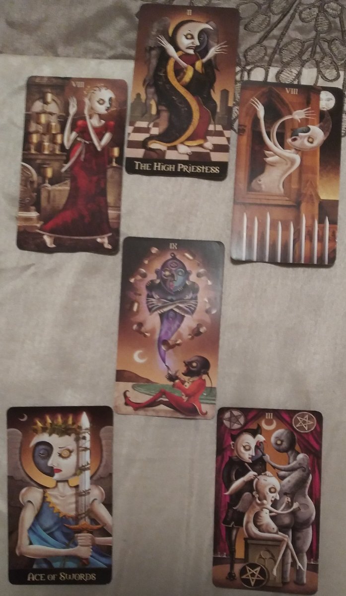 AnomalyTempest Posted April 28, 2022 Posted April 28, 2022 On 4/13/2022 at 10:58 AM, AnomalyTempest said: Once again your spread gave me some great insights. Again I used the Study Card as the significator. I really learn a lot from letting the cards interact with one another. I actually did this spread yesterday and it is laid out beside me as I type now. I'm sharing a picture this time so it will be easier to follow along. My first impression was AGHHH! There was a whole of that going on. Especially on the top row, then the Ace of Swords is like, "Stop right there! Get to work. Make your dreams come true." Looking more closely, I notice that both the eights and the Ace feature a woman with the High Priestess's face. It seems as though when she is concentrating on her inner thoughts (the eights), she's all, "Oh I have so much to do, I'm dying. Everyone expects so much." The Ace, again, is telling me to stop that. Get out of my head. I tend to get in too deep. I started a company with my best friend and I really should be focusing more on that than my inner work. Amusingly enough, my company is called Wishful Whims and genies grant wishes, so the image on the 9 cups seems to especially reinforce the idea of working more on the company. TLDR: This Priestess could be telling us to step back and focus on the real world for a bit. Edit: As soon as I hit post, I "heard" the Ace get a hold of yourself. Edit 2: The Moon face with half closed eyes is exactly how I feel when I'm in my daydreamy state. The other face is me thinking of being in social situations. 😛 So coming back to this spread, I had a weird dream that one of my relationships was broken. I woke up and started thinking of all things that could be wrong. Then, like the Ace I decided to call the person, tell them about the dream and my feelings and we both laughed and everything is fine. Not saying it predicted this situation but it sure helped me handle it in a more mature way instead of keeping it to myself and letting anxiety snowball.