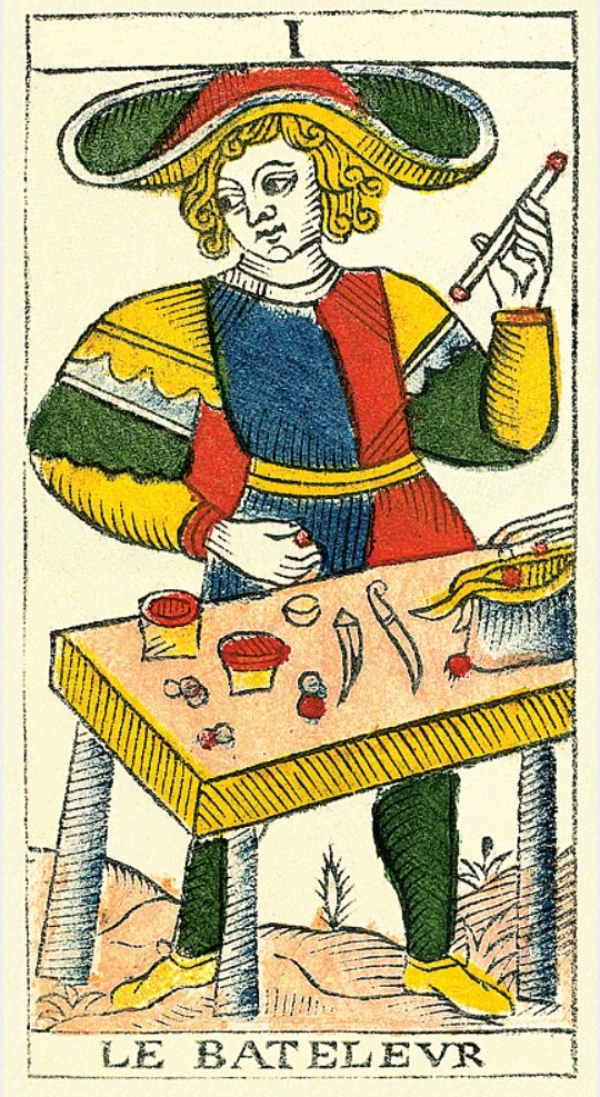 fire cat pickles Posted February 7, 2023 Posted February 7, 2023 Here are two images of the Madenié Bateleur. The image on the left is from the AT website (1st edition). The image on the left is the 2nd edition from Tarot Heritage. I doubt he would move backward and reuse the 1st edition as a template for the 3rd. That wouldn't make much sense.