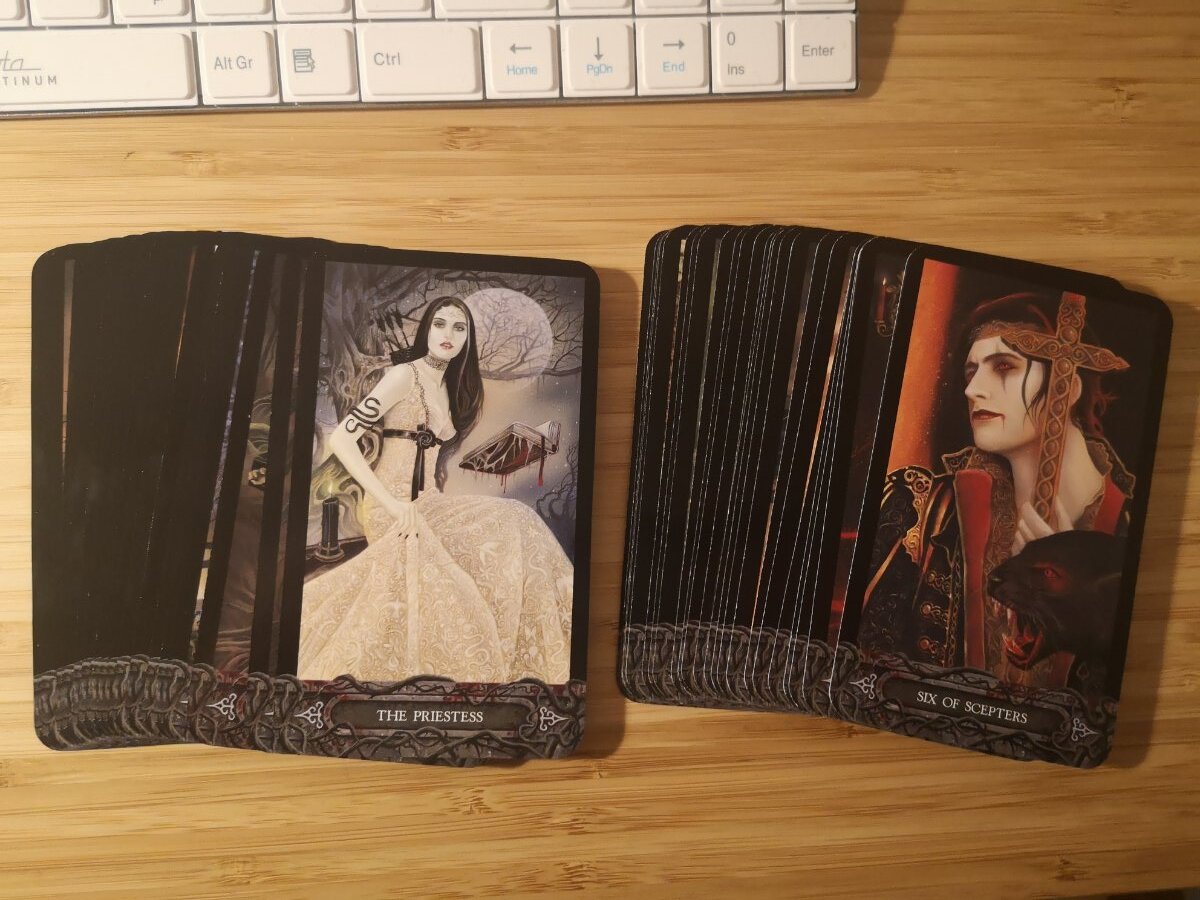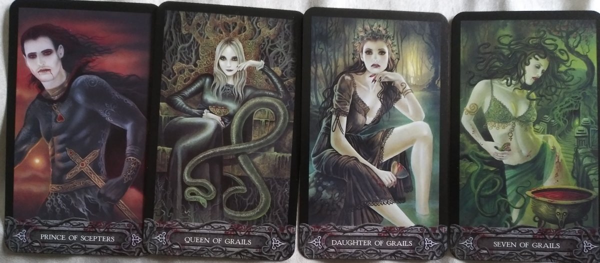 AnomalyTempest Posted May 5, 2022 Posted May 5, 2022 @Wyrdkiss On my Tarot of Vampyres and Tarot Nova I used a regular old sharpie. I googled deck modifications and watched videos from Boho Tarot, I think it was. She had one where she used Sharpies, various art markers and even crayola markers and highlighters. Being that decks I did both have dark backs and backgrounds it's hard to see any bleed over. I'm a bit more hesitant about my Game of Thrones tarot as the borders are part of the art and they appear distressed or old as though some of the paint her worn off. I am going to have to go to the art store and try to find a marker that's very light, perhaps the color of old velum or something. I might also try a black marker that's running out of ink but since I don't keep those lying around it would be a slow process. Here's a close up of one of the cards to show the aged look they are portraying. @sweeneyish When I say that Page I thought of your five decks and the Ace saying, "I have everything I need and most of what I want." That's something I tell myself all the time. They just keep making new stuff to want. I did kind of a conversational reading today. I sent in my personal essay which is a requirement for the course of study I'm interested in which is the first step to becoming a Priestess in my system of belief. I didn't really have anything else on my mind as I shuffled and basically asked the deck what was up. I'll lead with the picture and then add my text after. Card 1: Hello again, Prince of Sceptres You look like you are in such a hurry and just can't stop to talk. Where are you racing to? Card 2: Queen of Grails. Mistress of Intuition. Our Prince/hero/self/whatever is following a deep dream. Now that he has made a decision he wants to be off to the races but this Queen isn't going anywhere. She looks fine with waiting however, long it takes. He won't miss her. This really seems in line with the sending off of my essay and the waiting for a response. What is the best use of my time while I wait? Card 3: Daughter of Grails. It's definitely a time to reacquaint myself with my intuitive side. The process of writing this essay brought back lots of things I had forgotten about the women in my family being thought to have "powers". They often knew things they shouldn't have, and I remember my grandmother using her bible like a spellbook and taught verses to stop nosebleeds and things of that nature which were never encouraged by the more rational folks in church. It was too close to witchcraft. Those things just got buried through the years under a cloak of mainstream religion. When my grandmother died all discussion of "knowing things" died with her. Can I get this back? Is it really dead or is it just buried like all these vampyres were? Card 4: Seven of Grails: I had to laugh a little at this one because of the snakes in her hair. My hair has been called instadreads most of my life and I was always in trouble as child for not keeping it neat. My cousins used to joke about watching it loc up by itself. To this day I keep it up in a bun or braid because it's such a pain to comb. Let's just say I can relate to Medusa kin. I need to unbind myself. Everything is contained within me if I will only set it free. I had to stop here. There is a lot for me to chew on here. So many things have come up and so many long forgotten memories. I don't even know how to articulate it all but I can say none of it bad or traumatic so no worries there. Just so much not remembered for so long that it feels kind of heavy.