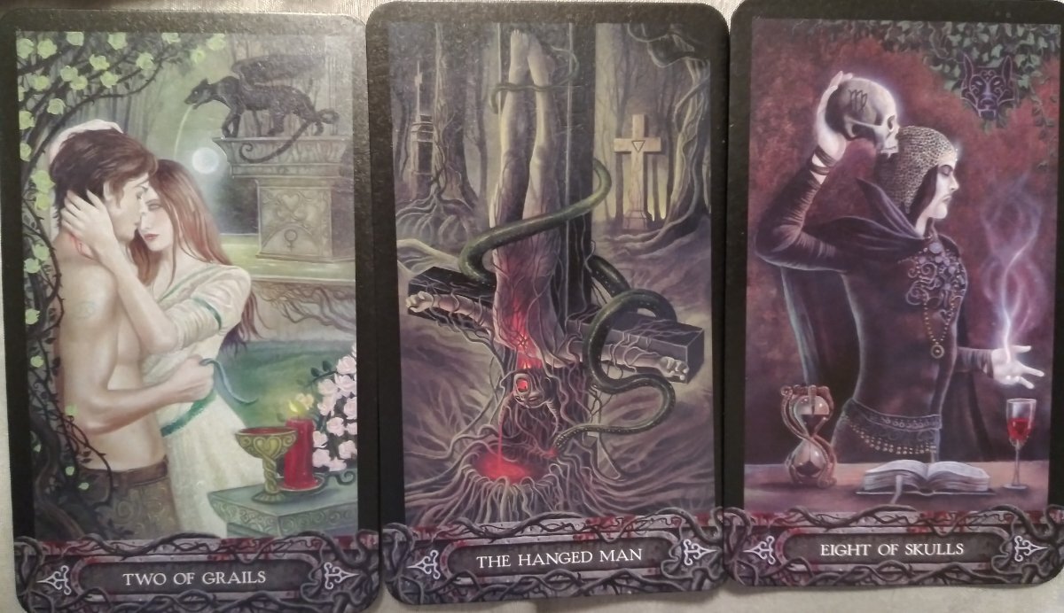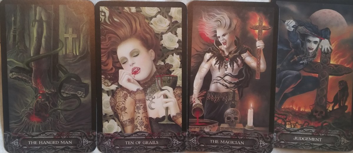 AnomalyTempest Posted May 2, 2022 Posted May 2, 2022 @Page of Ghosts I love the way the cards look now. I might just give that a shot. I'll find the right marker though. Also the Tarot of Vampyres is a Thothy deck. I got this deck after watching a deck study that was started on another forum a while back. It was so interesting I bought the deck and joined in. The Fool is one of my favorites as well, and the Queen of Scepters is the background image on my phone. The Hermit is my lock screen. He's my Soul card. The Eight of Grails came up for me in a reading not long ago in a place it did not seem to fit at first. So I did what I always do and tried to figure out what I was looking at. The book calls him a deposed lord. Someone who is forced to leave. His chalice is held low, more like a begging bowl. This could be in the book I can't really remember. You said you were maybe feeling a push to move more quickly than, maybe, you wanted to. This Lord is being forced to move on as well. He's kept his crown and grail though. If you don't move something may make you. Don't be like the skulls in the Hermit card waiting for something to come drag you down your path. Either way you'll get there. Move forward or be dragged. Also, I use apps to "test" out decks I can't afford yet. Fool's Dog has a lot and I'm always getting google survey money and I just spend it on apps. Sadly some of my favorites haven't been updated to work on newer phones but Fool's Dog always works. My monthly spread for May: 1. What baggage should I leave behind this month? The Hanged Man: I tend to get myself all tied up in my thoughts. I also can get very rambling with my thoughts, symbolized by blood spewing out of his mouth. Not everyone is interested in my inner world and I need to stop feeling put out when they don't care about my interests as much as I do. There is a time and place to geek out on someone. 2. How can I be less critical of myself and others? Ten of Grails: Get a good buzz? She's the only one that doesn't seem angry or scared or tortured in some way. She's chilling. With her eyes closed. Just happy in her little world. Now I have an old XTC song in my head. Making plans for Nigel even though he seems so happy in his world. I need to just enjoy what life is offering. Look at what I get to do, not what I have to do. 3. What area of my life needs to be reorganized? The Magician: The way I approach my work. I've been thinking a lot about how I thought I would be in a different place by now yet I have let myself bounce around my life like the fool up there in @sweeneyish's reading. Time to gather my tools and work my rituals. 4. What else needs to be done this month? Judgement: Ummmm......, Maybe he's defending from all the distractions I get caught up in? Overall I need to bring my game face. To my work, not people, including myself. I need to chill out and enjoy people. 2