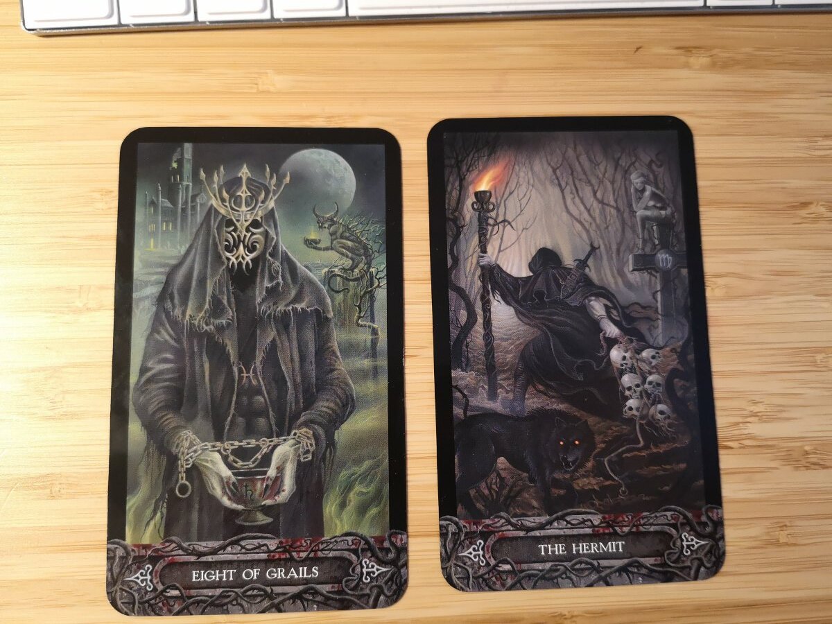 sweeneyish Posted May 2, 2022 Posted May 2, 2022 (edited) 3 hours ago, AnomalyTempest said: @sweeneyishI am really diggin' those cards as well. I like reading your takes on the cards as I often see things just a little different. To me the Fool seems oblivious to the protection and love around him. He's just traipsin along doin' his thing. That's just me me makin' up stories in the pictures though, not a comment on your reading. @Wyrdkiss I have a physical journal but I was thinking of reviving my one here in the journals section from way back years ago or just make a new one. I use a disc bound journal so I can rearrange my pages and yet it is still a small size to carry in a bag easily. For years I used an old high school binder with a zipper but it was just too huge. I wanted something smaller. Aw, I love this take, @AnomalyTempest - I totally see that now that you've pointed it out, and yeah, it hits close to home too - That was a good one! 2 hours ago, Page of Ghosts said: I am fine with being both tagged and quoted 😊 I'm not one for rationing my words so I often type a lot and tagging is probably more economic in the end. Here are some pictures of my modded Tarot of the Vampyres - I did miss some spots all over the deck or perhaps I didn't coat it as much as I needed to, it was hard to see using a black brush pen even under my strong desk light. I will have to do a second coating later this week but I am pleased with it overall. Black edges really suit this deck! I made sure to take some pictures midway through so you can see the difference as it transformed. Apologies for my messy deck in the background of all these pictures. I also did a reading which came out rather mysterious yesterday - how to best work on finishing my personal writing project. I hit a big milestone this week, but there is still so much left to do before it's even close to done. I actually did the spread in the app, which I really recommend if anyone is curious at all about this deck and want to give it a try before committing to a physical version, which is what I did. It's not very expensive, has some fun spreads and most important of all: it comes with the full guidebook! The guidebook is big and meaty, and the cards all have their astrological correspondences written in it as well as in the cards - just look for the symbols. I wonder if this deck might lean a little Thoth-y as I don't get a purely RWS impression from neither the cards nor the guidebook itself. The Eight of Grails is my positive influences and The Hermit is my obstacle. I found these to be very interesting cards for a creative writing project, especially The Hermit as writing typically is a thing you do alone. For the Eight of Grails I'm happy to be done with a big part of my first draft which I don't have to revisit until the entire first draft is done and I go back in to edit, but overall my hands are still tied in my personal obligation to see this project through. This card was also one of three I pulled the day before as I finished that big part of the project so seeing it again so soon seems significant. The Hermit is a tricky one, but one thing that comes to mind is my resistance about sharing my creative projects with others. A little secrecy is fine, but it often tips over to too much for me. Maybe it's fine to go looking for test readers a little earlier than I had planned for? Any insights to these mysterious cards is appreciated! Those look super cool! And this is a really interesting deck, in general. I think your reading sounds pretty great there. For this particular Hermit, it's interesting that's he's running away, and that there's also a wolf (seemingly) guarding his back. I don't know if that connects to what you were saying about sharing your work at all, but it seems interesting to me. The other thing I noticed is that the character in the Eight of Grails is staring straight at you, while the Hermit is facing away. Something about the Eight of Grails says moving towards your goal, while the Hermit is actually walking away from it. To me - having never used this deck and really just going on images. It may be totally useless, but hopefully some food for thought! Edited May 2, 2022 by sweeneyish