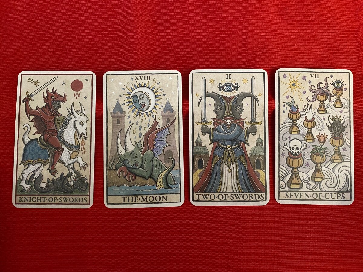 sweeneyish Posted May 3, 2022 Posted May 3, 2022 9 hours ago, Wyrdkiss said: Ok, how weird is this -- I unconsciously looked for the Hermit instead... That is very interesting, indeed. Maybe the Hermit has something to tell you. I’m going to try out this activity later today - thanks for posting it. Influences - May 3rd I had an interesting reading this morning - Here’s what I got: The Knight of Swords appears again! I’m seeing this reading as a process, from past to future. The Knight of Swords is driven, action oriented, and ambitious. In the next card, the blood moon transforms into a mystical, imagination giving Moon, and the Knight has become the sleeping demon, submerged in the waters of dream and intuition. Action gives way to introspection and imagination. In the Two of Swords, the demon wakes up from the dream. The murky towers in the distance have become two solid buildings, the water solid ground. I’m faced with two options - to move back through the past (left) or to move forward (right) to the next card: the Seven of Cups. Looks like the dreams the Moon planted appear as offerings here. Many options manifest from the world of dream. Time to embrace my imagination and intuition, and see what dream offerings await.