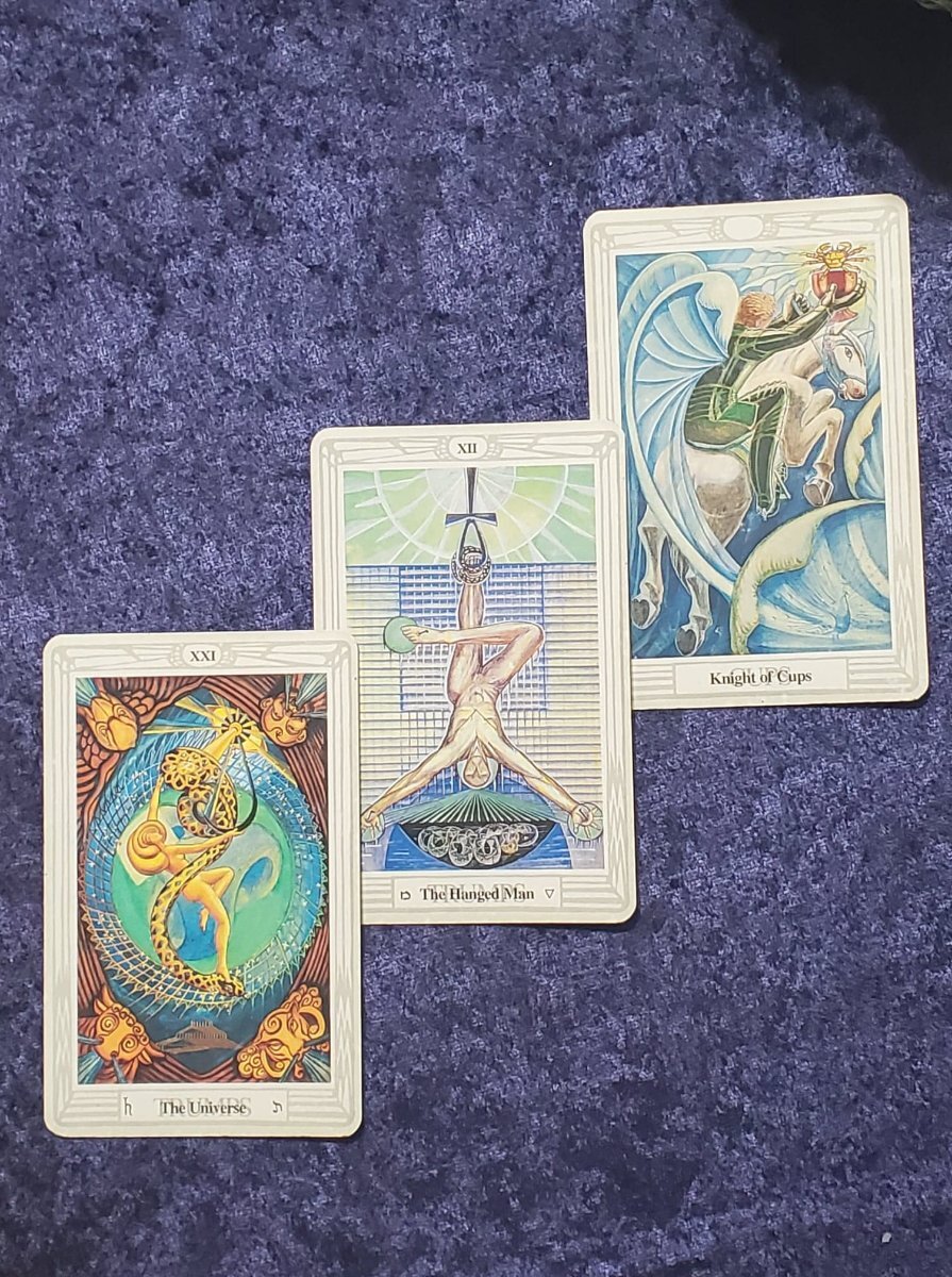 Wyrdkiss Posted May 5, 2022 Posted May 5, 2022 (edited) On 5/3/2022 at 7:17 PM, AnomalyTempest said: And I did it! The pic is from when I was just finished with the Trumps. I am super happy with them. The deck looks so much better now. Nice @AnomalyTempest. Question -- what type of ink marker do you use? My local art supply store is a bit hesitant on which to recommend for tarot edging, to avoid one that smears. I want to green-edge my Enchanted Forest. @sweeneyish I'm looking at that Page of Cups and seeing yet another court card in the Luna that suggest gluttony. Interesting but I'm not sure what to make of it yet. Today I did the Hanged Man exercise I previously posted, this time stopping at the proper card! The one behind the Hanged Man is the Prince of Cups. In front is the solution, is the Universe -- the last of the Major Arcana. The Thoth does Court Cards differently from RWS style. I will break that down later. But the prince of cups is a problematic fellow when Ill-dignified, when his more negative / unhelpful approach to the world is at work. In this case, when acting in his mode of personality, an individual (of any gender identification) does not follow through on their ambitions and slew of ideas. Their very being is infused with creative inspiration and lofty ideas, but as Crowley put it, "his very name is writ in water." Indolent, they begin the creative process, but it soon dissolves away. I can be guilty of this, and I know I have more writing to publish, but getting from inspired idea to output has been a challenge this past year. The universe is a card that is hard to see here, as it offers little tangible solution. It is encouraging, however. Crowley writes of the Universe, "Treat time and all conditions of events as Servants of Thy Will, appointed to present the Universe to thee in the form of thy Plan." Thus, I am trying to be spiritually vigilant -- no assumptions, but lots of observations. And faith that I am doing precisely what I need to be at the moment, so long as I'm following through with my instincts and drives. I look forward to your thoughts. The spread: Edited May 5, 2022 by Wyrdkiss