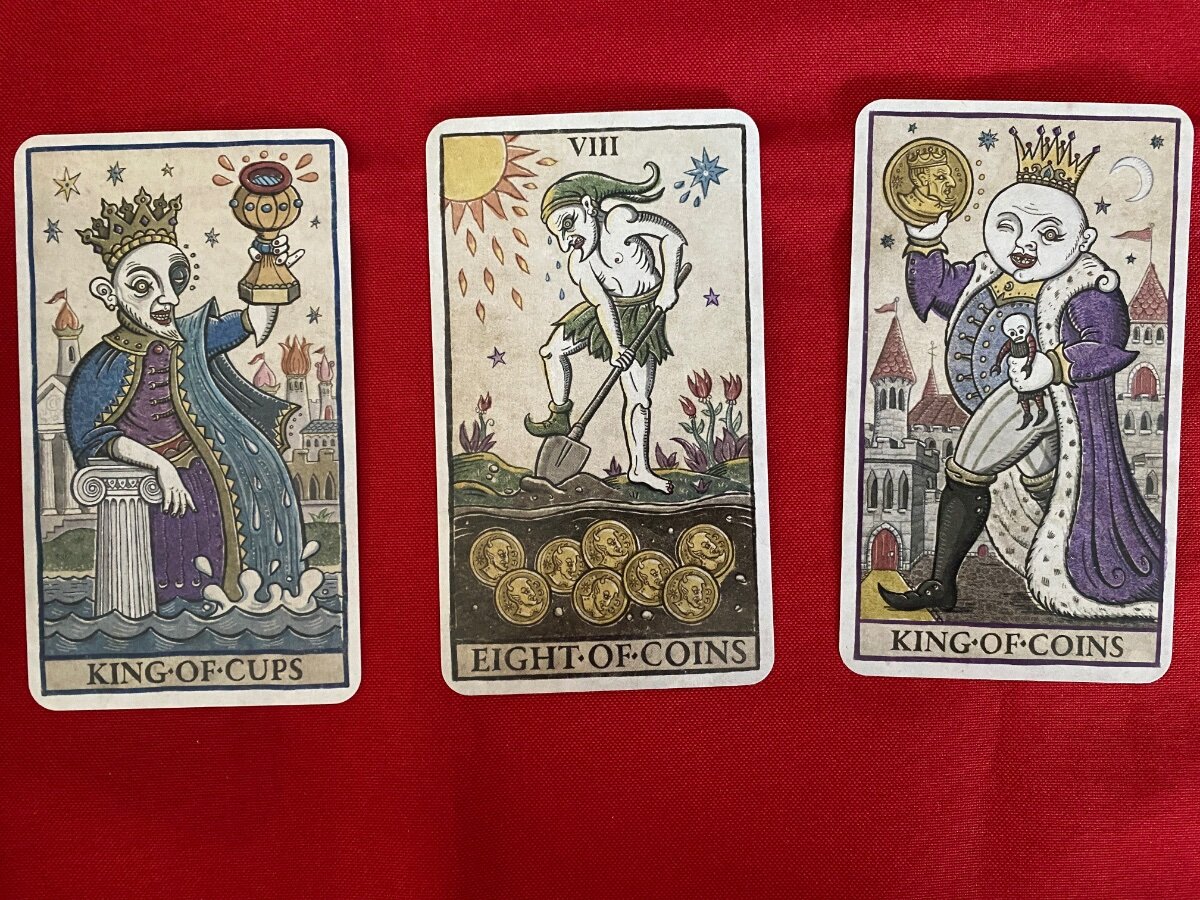 sweeneyish Posted May 5, 2022 Posted May 5, 2022 And my "Influences" reading for today: King of Cups: Emotional stability, outpouring of love and compassion. VIII of Coins: Hard work, toiling, but with a treasure waiting after all the hard work. King of Coins: The fruition of the work of the VIII of Coins. The King effortlessly holds the Coin, enjoying the fruits of his labour, perfectly in control of his life and success. It’s funny, my partner and I were talking about leadership styles last night, and I have been finding in my new(ish) role at work I’ve been discovering my own style, which is very King of Cups - Connecting with people on an emotional level, being compassionate, listening, generosity. The reality is, it is hard work, and I have to keep at it, knowing it will pay off in the long run (VIII of Coins). If I do, I will be able to embody some of the confident and assured stability of the King of Coins.