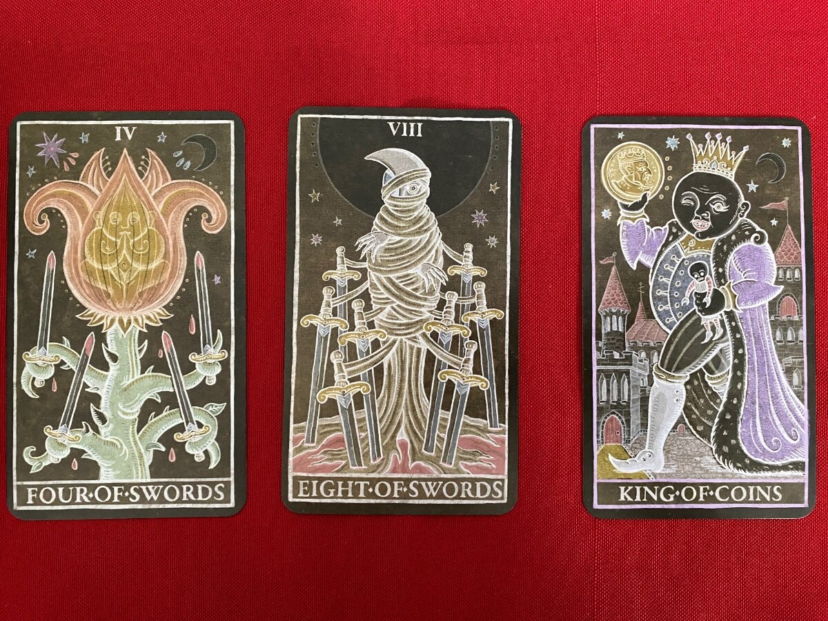 sweeneyish Posted May 11, 2022 Posted May 11, 2022 @Page of Ghosts Do you make your own deck bags? I wish I had that skill and patience! May 11th This is a really interesting spread, especially after the stillness of the last spread. There’s a lot of decisiveness and authority here. To me, it looks like the Emperor is sending his troops out to battle. The Emperor: I just noticed how bird-like he is - his cape is actually bird wings, and his feet look like talons. He is self-disciplined, structured, and stable. Knight of Swords: He is vicious and aggressive, full of confidence and power. Don’t mess with this dude! Courage, massive action against problems, a little restless. King of Swords: He is a lot like the Emperor. Authority, power, discipline. He has high moral standards, but don’t cross him or he may resort to less than honourable means to ensure victory. I think today is a day to lean into my self-made structures, to be disciplined in body and mind, and maybe be ready for some battles. If they arrive, I need to be decisive and courageous, and not defer to my usual passiveness.