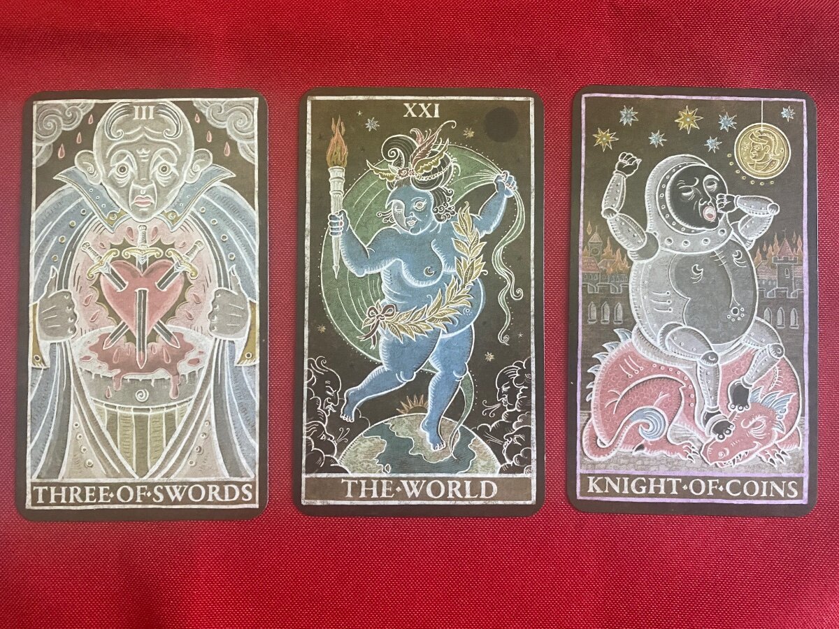 sweeneyish Posted May 9, 2022 Posted May 9, 2022 And my reading for today (Sorry for the multiple posts, I hope that wasn't annoying - I had a lot of catch up on the thread!) Gah, Three of Swords two days in a row! These swords are following me around lately. I'm just going to give a quick full picture interpretation here. In the centre we have the World - Yay. This is (I guess like most people?) one of my favourite cards to get. For me, it has a lot of spiritual significance in my Buddhist practice, although Tarot and Buddhism would not appear to go together in most ways. My principle practices are translated roughly in English as "The Great Completion/Perfection" and "The Great Seal", with the seal being on all of reality. For me, the World represents the deepest level of those practices. So to 'achieve' the World, I have to turn (like the World) to and embrace my pain (Three of Swords), and not allow myself to be distracted/try to bypass those pains with shiny things (Knight of Coins).
