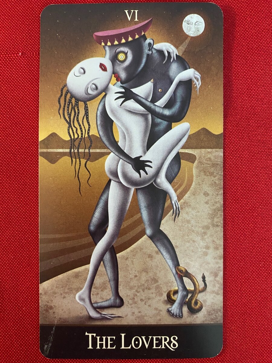 sweeneyish Posted May 14, 2022 Posted May 14, 2022 VI. The Lovers Two lovers embrace each other on the shore of a lake, in the middle of a vast desert. The female lover has her head thrown back, her eyes closed and her hair drifting towards the emotional depths of the lake. The male lover had his eyes opened wide, deep in the throes of passion. He wears a purple hat that is reminiscent of a soldier. A venomous snake bites his ankle, unnoticed. In the sky, the Deviant Moon displays its full power, its intoxicating energy flowing into the pair. Here are a few details I noticed looking over the card this morning. First, the female lover is one of the only characters depicted without the crescent moon face (we only see half the male lovers face, so we could assume he has the same crescent moon face as the other inhabitants - maybe). The female lover’s hands are loose and relaxed, and her body flows quite naturally. The male lover is tight and rigid, his posture almost awkward, his hands tight. This is the first card where we see the full power of the Deviant Moon on display, including its face. This is also the first card in the Major Arcana that is obviously not located in the city. Even the Empress is not clearly out in the wild, and she has the tiled floor. Here we are in a new setting: a desert. A fun fact from the companion book: The female lover is the same inhabitant depicted in the V of Pentacles. It looks like the relationship didn’t pan out… Keywords: Passion, harmony, romance, partnership, union, duality, intimacy, relationship Some questions for your consideration: 1. What does the snake symbolize? Why is it there? 2. Why are these Lovers in the desert? 3. Who are these characters, and how did they meet? 4. There is a dramatic shift in narrative from the Hierophant to the Lovers. Is there any connection between these two cards?