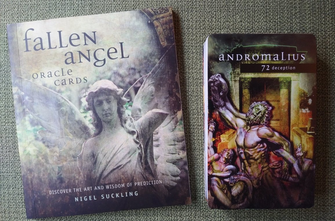 KaiNO Posted May 24, 2022 Posted May 24, 2022 I loved your post @Rachelcat, very informative 👍 I wasn't aware of the "Complete Magician’s Tables" by Stephen Skinner, or the Fallen Angel Oracle Cards by Nigel Suckling. I must show you this picture I just took: Yeah..., it's my kickstarter versions of Goetia Tarot in Darkness and Notoria Tarot in Light. Still unopened, but one day when it feels right I will start using them. And now thanks to you , "your" oracle deck with the same demons is winging its way to me too 😊 On 5/21/2022 at 10:38 PM, Rachelcat said: I’m going way, way out on a limb this week. My deck this week will be Fallen Angel Oracle Cards by Nigel Suckling. It’s a cemetery statuary photo collage deck based on the 72 demons of the Goetia. I have my Complete Magician’s Tables by Stephen Skinner handy for some help with the source material. (If you care, the deck is based on Weir’s list of demons (c. 1570), not the Harley manuscript (c. 1600). I love learning about where all these occult ideas come from.) (I recently found out that the new Lo Scarabeo deck, Goetia: Tarot in Darkness, is based on the same demons. And there will be a matching Notaria: Tarot in Light based on the Shemhamephorash / 72 names of god coming soon. So I’m just waiting for another Llewellyn coupon to grab them up, too! I’m a bit wary of their tarot attributions, but maybe I can ignore them?) Considering it consists of demons, it’s interesting that the deck has positive as well as negative keywords and messages, so I think it can be used as a “regular,” if gothy, oracle. The book has, for each card/demon: element, planet, message, description paragraph, and “motto” (the keyword that’s on the card). I find it kind of annoying that there’s so much repetition of keywords. By my count there are: 5 dangers 4 upheavals 3 honesties 2 celebrations 2 harmonies 2 recuperations 2 transformations 2 changes 2 travels 2 strengths 2 turmoils I guess the author is trying to stay true to his source material, but, hey, there are only 72 cards! Maybe come up with some synonyms? Well, I’m going to try it out, quibbles and all! A serious wash and shuffle and then an interview! I’m going to read by the keywords first, then check in with the demon’s appearance and abilities as listed in Skinner. Most important characteristic: Valac, resolution A deck of demons probably isn’t the most popular idea for an oracle. It takes resolution on the part of the creator and the user (me!) to give it a try. I was too superstitious for a while to really dig into it, but now I’m ready to work with it. Valac appears as a boy with angel wings riding a two headed dragon. He brings snakes. So here we have boy with wings and some snakes. No dragon though. Strength: Morax, leadership The deck’s strength is that it’s a forerunner of the current spate of demon decks coming out. It leads the pack. Morax looks like a bull with a man’s face. He teaches astronomy and the virtues of herbs and stones. Ok . . . ? Here’s a bull, anyway. Weakness: Malphas, danger Meta weakness: five cards have the keyword danger. Such repetition is a weakness of the deck. Malphas appears as a crow. He builds towers and houses. Here’s a crow with a building. I guess the large cross is a tower, maybe? What can I learn from the deck? Amdusias, harmony I can learn to harmonize the positive keywords with the gothy illustrations. I can learn about the harmony (instead of opposition) of the demons with the angels. Amdusias appears as a unicorn who causes musical instruments to be heard. Here we have a Pegasus unicorn next to a fallen Celtic cross. We’ll imagine the music . . . How can I learn it? Belial, friendship I can learn about the harmony of the angels and demons by looking at them all with friendship. Or realizing that they’re really all friends: a Good Omens situation! Belial is one of the highest ranking kings. This is a demon name that seems familiar. Maybe he’s in the bible? He appears as a beautiful angel in a chariot and grants political favor. That’s him up in the sky above an impressive government building. Outcome of our work together: Orias, inspiration Well, inspiration is good. I will be inspired to continue my angel and demon journey, with this deck or others. And to not be superstitious or put off by shady occult things. They don’t have power over me because they’re not real. They’re just interesting ideas that I like to learn about. Orias appears as a lion riding a horse! With 2 serpents in his hand. Thankfully, this card does NOT show a lion riding a horse, instead we have an angel with a caduceus, that is, 2 snakes on a winged stick. He teaches the medical uses of astrology. Hmmm. Not sure how that’s related to inspiration, but I’ll take it! Well, that was fun! I’m glad I finally decided to give this deck a try, even though it’s because I’m coming down with deck acquisition syndrome! And now that I see that the illustrations are actually illustrating something, they’re more appealing than just random tombstone collages. I know this is SO LONG, but I enjoy sharing my discoveries with you!