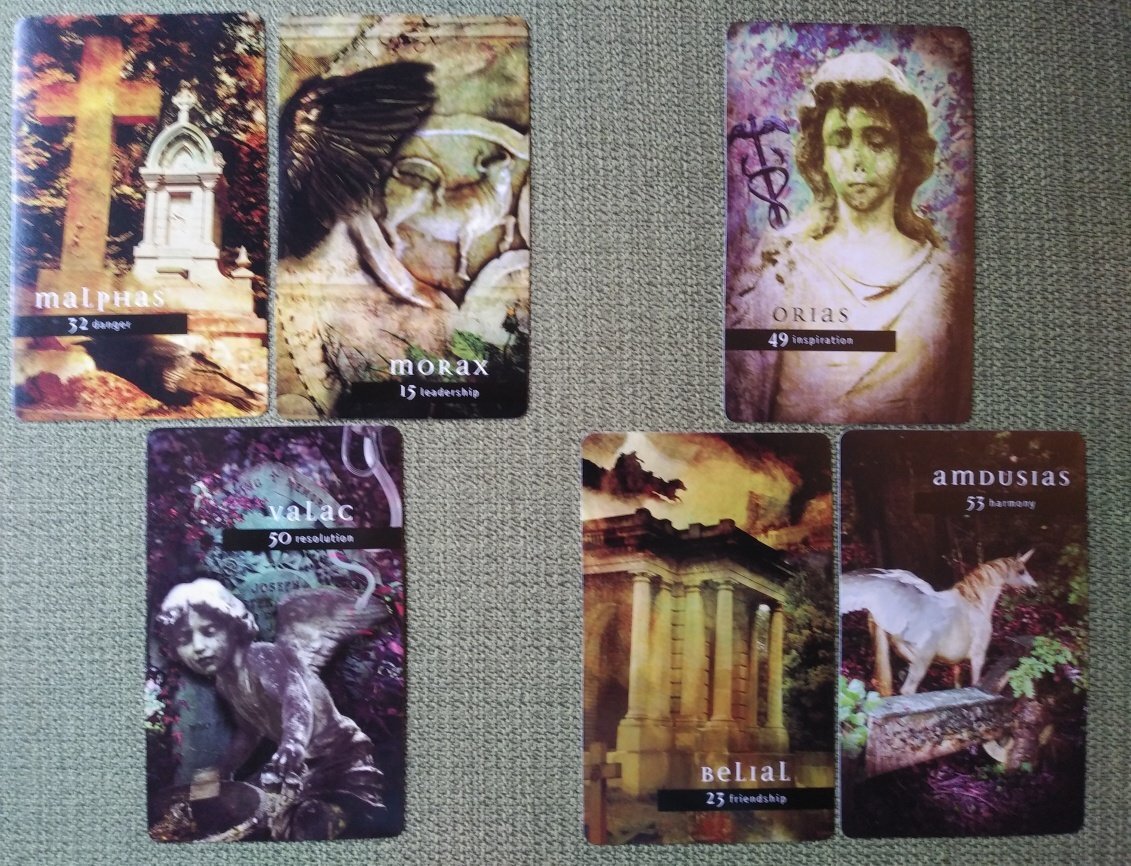 Rachelcat Posted May 21, 2022 Posted May 21, 2022 I’m going way, way out on a limb this week. My deck this week will be Fallen Angel Oracle Cards by Nigel Suckling. It’s a cemetery statuary photo collage deck based on the 72 demons of the Goetia. I have my Complete Magician’s Tables by Stephen Skinner handy for some help with the source material. (If you care, the deck is based on Weir’s list of demons (c. 1570), not the Harley manuscript (c. 1600). I love learning about where all these occult ideas come from.) (I recently found out that the new Lo Scarabeo deck, Goetia: Tarot in Darkness, is based on the same demons. And there will be a matching Notaria: Tarot in Light based on the Shemhamephorash / 72 names of god coming soon. So I’m just waiting for another Llewellyn coupon to grab them up, too! I’m a bit wary of their tarot attributions, but maybe I can ignore them?) Considering it consists of demons, it’s interesting that the deck has positive as well as negative keywords and messages, so I think it can be used as a “regular,” if gothy, oracle. The book has, for each card/demon: element, planet, message, description paragraph, and “motto” (the keyword that’s on the card). I find it kind of annoying that there’s so much repetition of keywords. By my count there are: 5 dangers 4 upheavals 3 honesties 2 celebrations 2 harmonies 2 recuperations 2 transformations 2 changes 2 travels 2 strengths 2 turmoils I guess the author is trying to stay true to his source material, but, hey, there are only 72 cards! Maybe come up with some synonyms? Well, I’m going to try it out, quibbles and all! A serious wash and shuffle and then an interview! I’m going to read by the keywords first, then check in with the demon’s appearance and abilities as listed in Skinner. Most important characteristic: Valac, resolution A deck of demons probably isn’t the most popular idea for an oracle. It takes resolution on the part of the creator and the user (me!) to give it a try. I was too superstitious for a while to really dig into it, but now I’m ready to work with it. Valac appears as a boy with angel wings riding a two headed dragon. He brings snakes. So here we have boy with wings and some snakes. No dragon though. Strength: Morax, leadership The deck’s strength is that it’s a forerunner of the current spate of demon decks coming out. It leads the pack. Morax looks like a bull with a man’s face. He teaches astronomy and the virtues of herbs and stones. Ok . . . ? Here’s a bull, anyway. Weakness: Malphas, danger Meta weakness: five cards have the keyword danger. Such repetition is a weakness of the deck. Malphas appears as a crow. He builds towers and houses. Here’s a crow with a building. I guess the large cross is a tower, maybe? What can I learn from the deck? Amdusias, harmony I can learn to harmonize the positive keywords with the gothy illustrations. I can learn about the harmony (instead of opposition) of the demons with the angels. Amdusias appears as a unicorn who causes musical instruments to be heard. Here we have a Pegasus unicorn next to a fallen Celtic cross. We’ll imagine the music . . . How can I learn it? Belial, friendship I can learn about the harmony of the angels and demons by looking at them all with friendship. Or realizing that they’re really all friends: a Good Omens situation! Belial is one of the highest ranking kings. This is a demon name that seems familiar. Maybe he’s in the bible? He appears as a beautiful angel in a chariot and grants political favor. That’s him up in the sky above an impressive government building. Outcome of our work together: Orias, inspiration Well, inspiration is good. I will be inspired to continue my angel and demon journey, with this deck or others. And to not be superstitious or put off by shady occult things. They don’t have power over me because they’re not real. They’re just interesting ideas that I like to learn about. Orias appears as a lion riding a horse! With 2 serpents in his hand. Thankfully, this card does NOT show a lion riding a horse, instead we have an angel with a caduceus, that is, 2 snakes on a winged stick. He teaches the medical uses of astrology. Hmmm. Not sure how that’s related to inspiration, but I’ll take it! Well, that was fun! I’m glad I finally decided to give this deck a try, even though it’s because I’m coming down with deck acquisition syndrome! And now that I see that the illustrations are actually illustrating something, they’re more appealing than just random tombstone collages. I know this is SO LONG, but I enjoy sharing my discoveries with you!