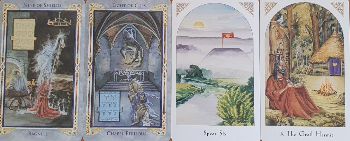 euripides Posted May 22, 2022 Posted May 22, 2022 (edited) I've been considering getting the Druid oracles even just for the art. Beautiful stuff. Today's reading with the Ferguson Legend Arthurian and the Matthews' Arthurian was super interesting, and was a bit of a lesson in one way to think about using highly thematic decks. With a fairly standard RWS deck, a long familiarity with the cards tends to make them easy to read with a combination of 'standard' meaning and intuition - the two tend to blend. These decks start to need a bit more digging into the symbolism and story (for me, anyway), but when I take that time, it's rewarding. First nine of shields (pents). Central to the story of Dame Ragnell is autonomy or 'sovereignty' as it is in the text - the ability to make one's own decisions. Her being accorded that freedom by Gawain breaks the curse she is under. In the card, Gawain is turned to the fire as she transforms - it's a very grotesque image, as she holds up floppy hands on stretched-out sleeves like an empty costume. Next is the Eight of Cups, Chapel Perilous. Launcelot has made it into the chapel but within a giant evil hand threatens to extinguish the sole candle. The writer of ShamansPath Weblog says of this card 'Do not let anyone or anything – especially yourself − put a bushel basket over your light. ~ Do not allow anyone or anything – especially yourself or your perception of your self − hold you under its thumb. If necessary: Leave. Move. Go elsewhere. Hastily. Try something else. Reach out for other options. ' There's a grey cast to these cards that make them really appropriate to my constant feeling of being mired down, stuck. The Arthurian offers light. The victorious flag of the six of spears, and the hermit. The hermit has been showing up a lot lately, and it's a card I'm always drawn to. I long for some real downtime. A week or two to just be, to breathe, to write and reflect. The Grail Hermit speaks to introspection and wise counsel 'be as my flowering staff', he says, set down roots. This is not the chatter of social media, but drinking deep from the well. The victory of the six requires effort; something to be proud of. This won't be achieved by the faint of heart, the lightweight dilettante. Edited May 23, 2022 by euripides