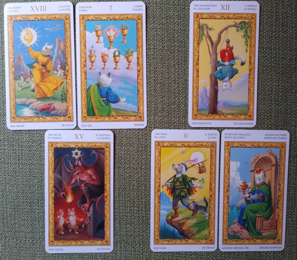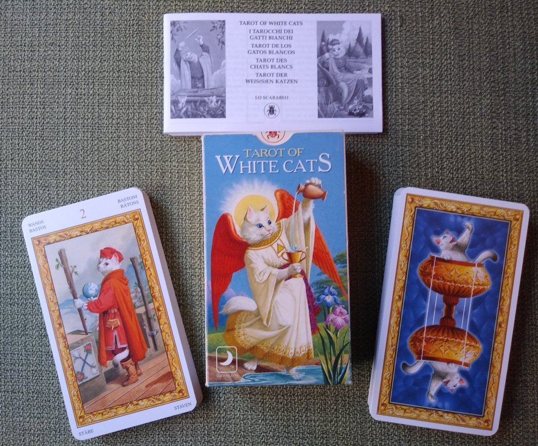 Rachelcat Posted May 28, 2022 Posted May 28, 2022 Good morning crew! I hope all our regulars are doing well! I look forward to Minchie readings this week! And I don't know about the Pavlov, so I'm keeping an eye out for that! My decks this week are Tarot of White Cats and Cat Comfort Cards. As you know, I’ve been using houses as randomly chosen spread cards, so I thought, why don’t I use a more oracle-y oracle as spread cards? And cats need to go with cats, right? Tarot of the White Cats is a Lo Scarabeo RWS clone with cartoon cats. It’s very cute and sometimes cheeky. It has the best 10 of Swords ever! Let’s wait and see if it comes up this week. It would be good if you want a deck that doesn’t have a bunch of white people. But the kitties do live in the same pseudo-medieval world as the RWS. And good for kids because no human nudity, and cats! These are from the bad old days when LS decks had reversible copies of a card as the back. But in this case it’s fine because the card is the adorable Ace of Cups. (And ornate borders and six languages.) Cat Comfort Cards is a Hay House oracle with 50 cards of very vibrant art. The cards have a punny or saying-based keyword on one side and a message from “your feline friends” on the other. I’ve never used it for anything except looking through and smiling at the puns. So today’s the day! Short interview for the oracle and long for the tarot! Strength: Cool Cat. Pride comes before a fall. Humility is needed today. Its strength is it gives practical advice. Pride and humility are always around, and sometimes we need them pointed out to us. Weakness: Black Cat. Lady Luck is with you. Just the opposite. You don’t want someone to base their actions on the turn of a silly card. But I like that it makes black cats lucky! What can I learn from deck? A cat always lands on its feet. Be ready for anything. Everything will work out. Encouragement. Even though things aren’t always how we want them to be, we can make the situation come out to our advantage. Outcome of our work together? Catacomb. Look deep inside. Take time to meditate or journey within. I feel like this deck isn’t going to be all that spiritual, but maybe I’m wrong! Most important characteristic: The Devil It’s much more subversive than I thought. Anthropomorphized cats (especially this Devil) are kinda creepy after all. Strength: 7 Chalices It’s one of many decks I have to choose from, but for the reasons I gave above, it’s worthy of being chosen sometimes. Weakness: The Moon It doesn’t really handle or present the more esoteric features of tarot well. Like the six-pointed star on the devil instead of an inverted pentagram. What can I learn from deck? Queen of Chalices I can learn to be open and read the pictures intuitively. It’s a fun deck and easy to read. Have fun with it and embrace the simplicity. Really look at it, like the queen is looking at her chalice. How can I learn it? The Fool By being really, really open. And approaching it like a beginner. Outcome of our work together: The Hanged Man I will enjoy working with it, but after this week, it will go back into my storage desk to wait for my use and attention again. Well, that was fun! I look forward to putting the spread card idea into practice tomorrow. And the new moon reading on Monday. See you then!