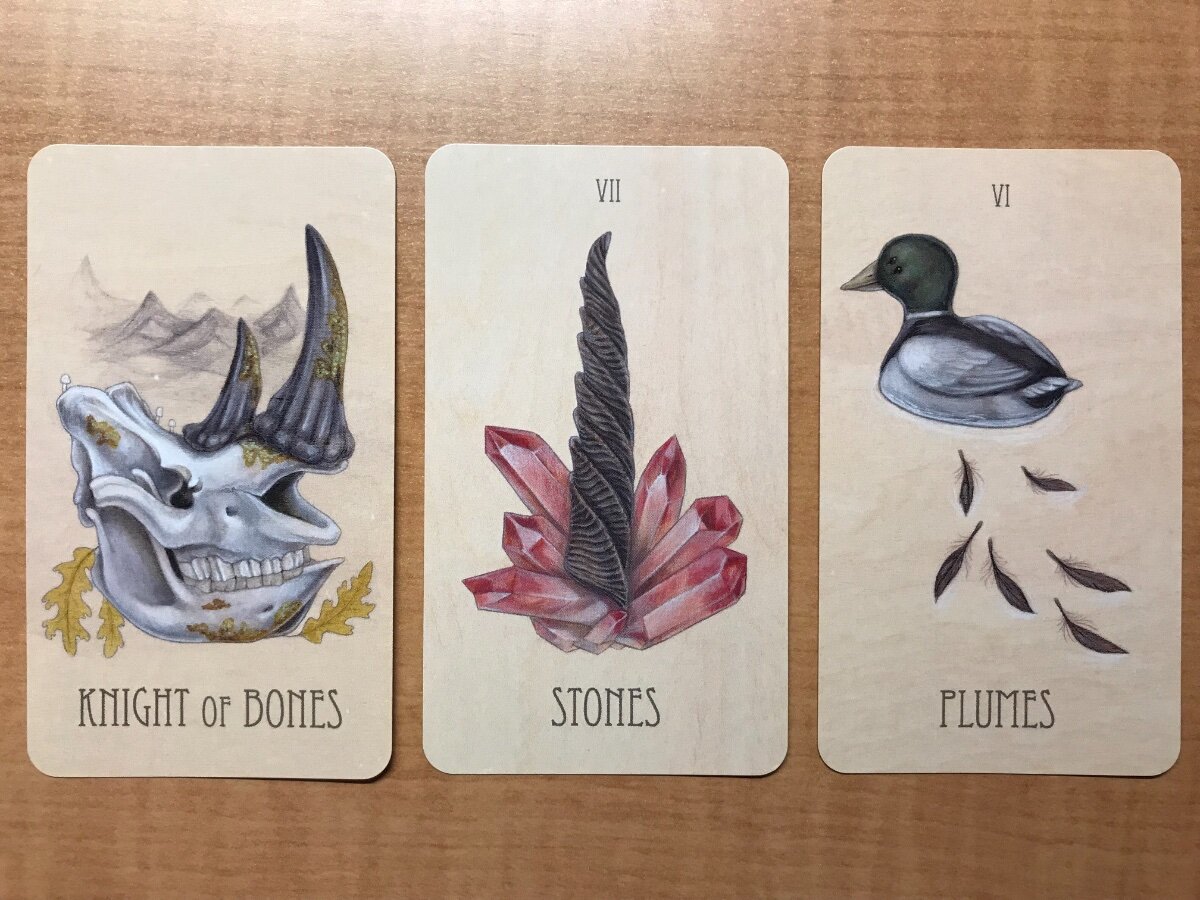 vulprix Posted June 8, 2022 Posted June 8, 2022 (edited) I have used the Wooden Tarot to help my battle with a compulsion: Knight of Bones, VII of Stones, VI of Plumes I need to stay steady and draw from my own strength. I must draw from what I already have and not be afraid to stand on my own without further material need (materials are a part of the compulsion). The VI of Plumes is my insight regarding swimming away from that which I know does not feed my mind well. With the feathers in the water, this tells me it may feel as though I am leaving parts of myself behind. This is a part of the peace I will need to achieve in order to get over the compulsion. Of course, therapy is always the best solution, and I am working on that 😄 But the tarot is a nice comfort sometimes, right?? Edited June 8, 2022 by vulprix Added picture