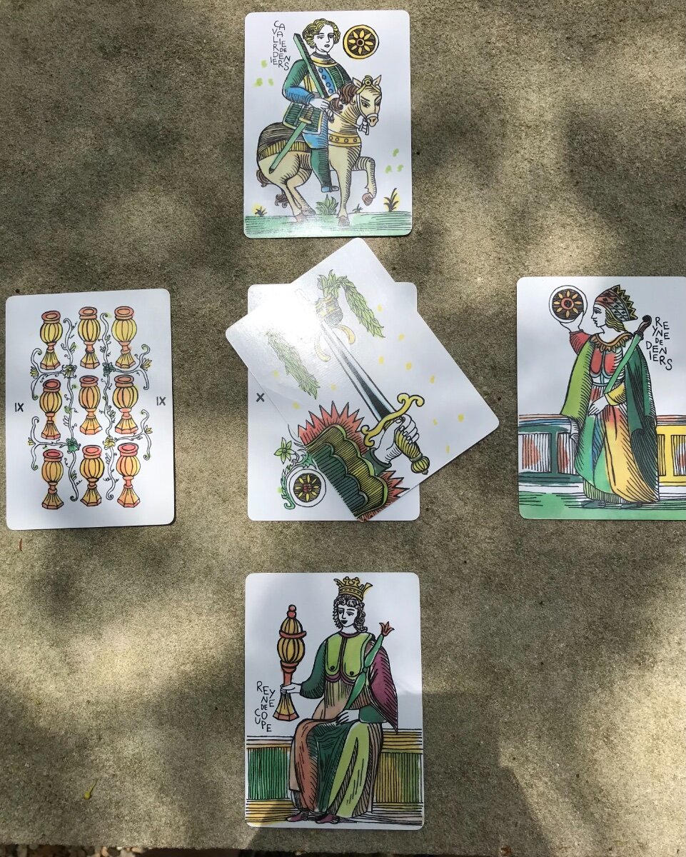 fire cat pickles Posted June 14, 2022 Posted June 14, 2022 1 hour ago, vulprix said: Oh, and @fire cat pickles—glad to be a TdM buddy! I love pip decks, and this is one of my favorites of all. I have done a little mini-cross reading about opening up more at work about my personal life. I typically keep almost everything to myself as privacy is very important to me, but I have been very happy at home and want to feel a little freer in camaraderie like my other coworkers. Issue: Ten of Disks crossed by Ace of Swords Past: Queen of Cups Present: 9 of Cups Future: Knight of Pentacles What to do/how to cope: Queen of Pentacles I'm not doing a very good job sticking to my initial interpretation, but it is this: Rather than continue the past introspection, seek to steadily, cautiously, and practically share more of myself. I have warmth to give and in which I can be confident. The happiness can be shared as long as I stay grounded. There is a bit of constancy here--the Queen of Pentacles of my approach moving forward is situated rather like the Queen of Cups of my past, but she is standing up instead. What I see is some freedom, but what may guide me best is practicality! (Doesn't really help me much, because I have a history of feeling like the most practical thing is to just keep my personal life to myself. 😆) Welcoming interpretation perspectives from anyone 🙂 Yes a TdM buddy! I normally don't use position or spreads but I'll try... I see you as the Queen of Cups here since she's holding the cups and you get the 9 of Cups/wish card in the future. And this is your wish card. So if you open up a few private details about yourself then it would be a positive. The question then remains, how to do it. Well, you have no Wands/work cards. The advice then would be not to do it at work. You have the foundation set (10 of Coins) already and the idea is strong (Ace of Swords). The Queen of Coins is /would be in agreement with you and can help you cope. This is an older woman with blond or gray hair. She is the "work mom" that everybody loves and gives out advice. Meeting after work for drinks or coffee would be the way to go, just the two of you, under the guise of talking shop, of course. Then once away from work, start to sneak in a few private details. The Ace of Swords symbolizes her "good ideas" pointing towards your "better enlightenment" (9 of Cups). In the future there will be others to join you, the Knight of Coins, in other away-from-work outings. He has similar features as the Queen of Coins. Does the "work mom" have a relative? A son or nephew or someone close to her? I feel they are really close because of the Coins-Coins connection. It may not be blood-related but they could be besties. At any rate they look like they could be related at least. The three of you could then start seeing each other after work.