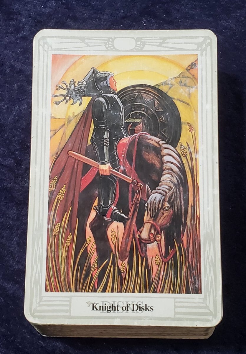 Wyrdkiss Posted June 17, 2022 Posted June 17, 2022 2 minutes ago, euripides said: You know I don't actually own a Thoth. I should rectify this. If keen on the thought, I hope you do. The Thoth has been my touchstone. You seem to be considering effort and motivation. Lon Milo Duquette, Occultist-Scholar and devoted teacher of the Thoth, says this in his book "Understanding Aleister Crowley's Thoth Tarot: "The Knight of Discs is unique amongst his brother Knights. He seems to be the shortest in stature, He rides a workhorse that seems to be more concerned with eying the lush grass than conveying his rider..." Crowley, goes into far more depth, saying, "His helmet is thrown back, for at the moment his function is entirely confined to the production of food." The author discusses a reluctant labor, and an emphasis on nutrition. If "ill dignified" this mode of personality can fall into the dull and laborious, but overall, one gets the work done in the end. Too much else to type, and you didn't ask for a reading -- but thank you for letting me share a few Crowley crumbs (not pun intended) and this image for you Euripides: "