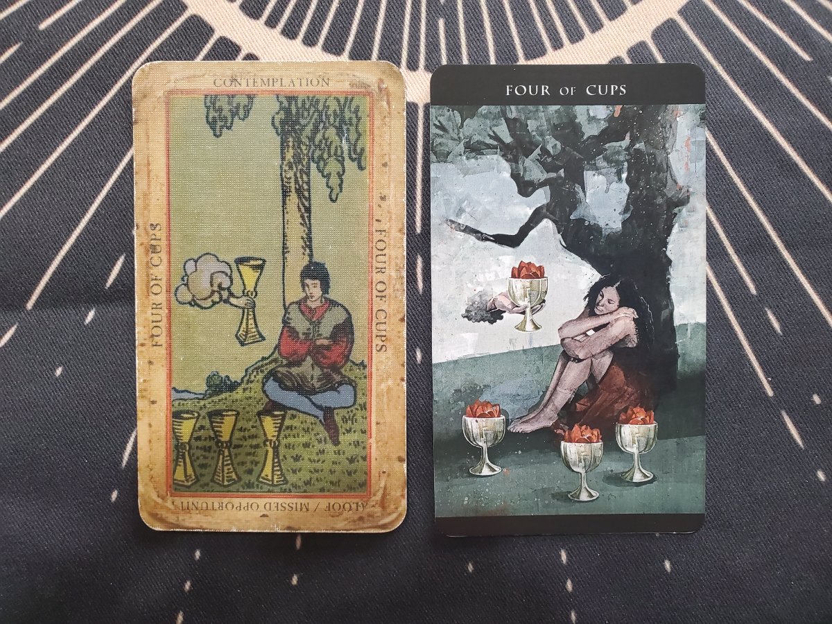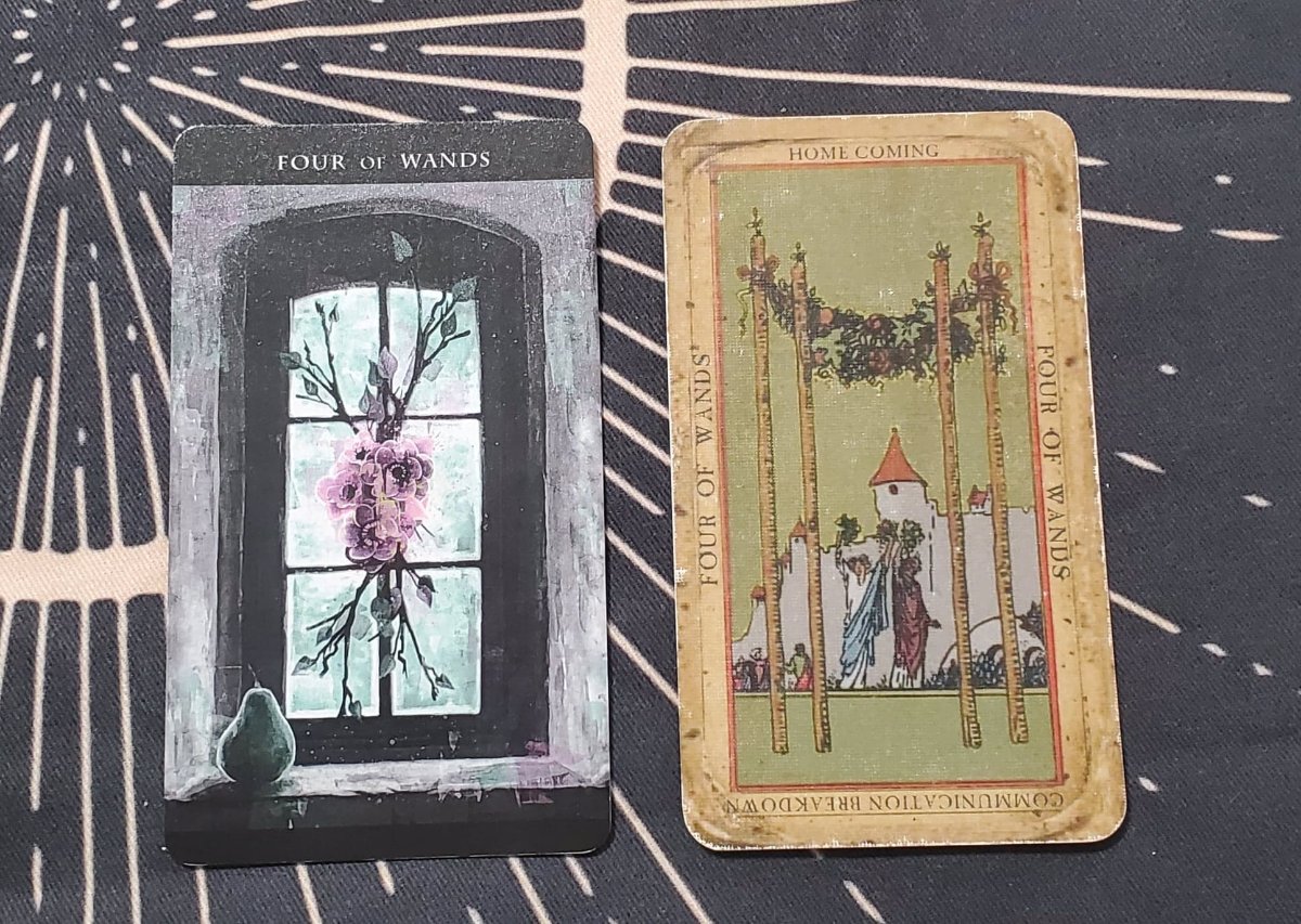 Wyrdkiss Posted July 10, 2022 Posted July 10, 2022 (edited) @Rachelcat that Prisma Visions complete view of the Sword is absolutely amazing. What a work of art. Added to my wish list for my collection just to geek out and show people this. OK, on to my comparisons of these two packs. I did a reading today about my creative pursuits. I have a YouTube channel (non-tarot related) and occasionally read for cards for clients. I asked for guidance as I am conflicted about where to put the most energy, or if to balance them at all. THere is a significant reading opportunity approaching, but I vowed at the beginning of the year to give the channel 12 months of focus. results: Queen of Cups ( Deck of the Bastard). Right Result: Four of Wands ( Darkness of Light Tarot) Query: What should I know about my conflict, what is next step? Query: Should I read at the Festival / Fair The cards are juxtaposed below for your viewing pleasure. I've journaled the results. I still have not determined my focus for these Deck of the Week threads. Do I want to highlight the cards, or use them to contemplate and share readigns. Hard to do both with time often pressing. I truly love the 4 of Wands in the Darkness of Light. Instead of a tent with the words, "Homecoming" like the DoB, it shows a beautiful home. Still working on what to make of that. The excellent Tarot App Galaxy Tarot suggests of the Queen of Cups: "She is an empathic, soothing and kind listener. She helps others to understand their emotions." Sounds like a proper tarot reading, yes? Images enclosed, I look forward to any feedback Edited July 10, 2022 by Wyrdkiss