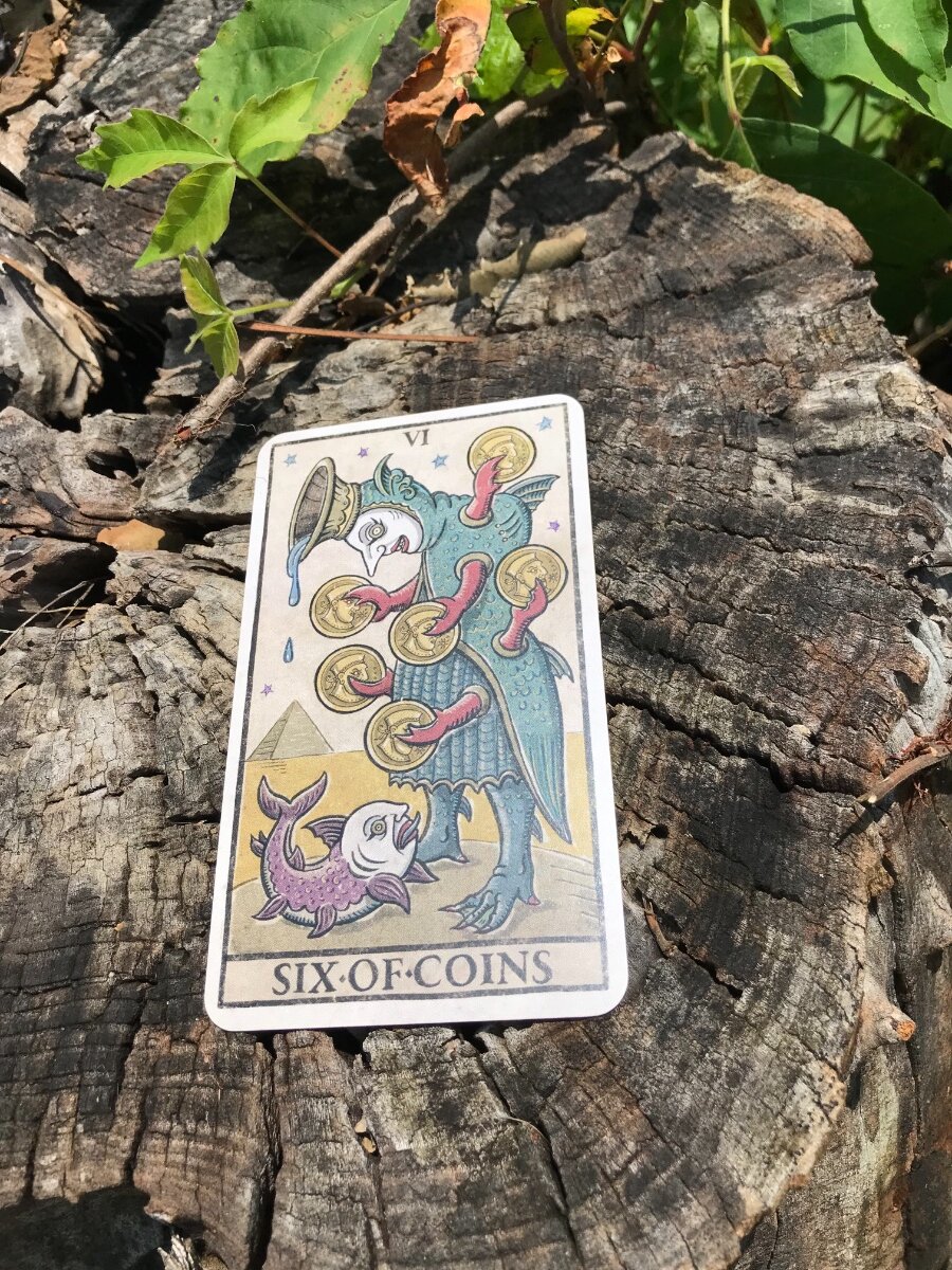 vulprix Posted July 18, 2022 Posted July 18, 2022 @Bodhiseed, thank you for the well wishes! I hope so too! 🥳 Winter Moon on Toyama Plain by Takahashi Shotei is so beautiful! I have never seen this print before and I am really glad to be introduced to it! I think a cool thing about it is that I have been to Toyama. It is such a beautiful place. My experience was more developed and residential than depicted 😁 but it is nifty to see artwork expressly of Toyama. Another serendipity with your post—yesterday I had quite the “nightmare hangover” so I felt seen when I read that, lol. You inspired my decision to draw a single card this week for advice on working my big school project this week: 6 of Coins from the Trionfi della Luna. Weirdly, I took this picture outside near a favorite little river of mine where I like to observe the fish! What this card says to me is to balance and utilize all of the nuggets (coins) of information I am trying to process onto paper right now, but to be sure to make time and share the earth with my fellow creatures, like the fish. Basically, I am seeing hard work not only toward, but also in aid by, my connection with nature and those that need me. The institutions (pyramid) will always be there in the background. Simply share what I know and things will proceed the best that they can.