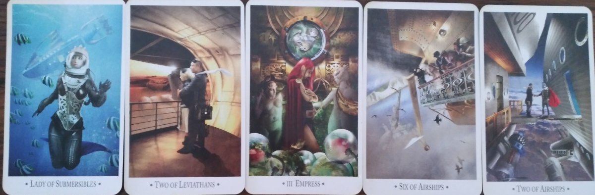 AnomalyTempest Posted July 17, 2022 Posted July 17, 2022 @Rachelcat that Cryptid Oracle is super cool! I love the colors. @Wyrdkiss Your deck is gorgeous. I can't wait to some readings with it. @Bodhiseed Those decks have artwork I can just stare at. I especially like the "Moon" card. I've basically just been lurking about the forums lately. I don't know what it is about being at home that makes me so unproductive. 😛 Here's my weekly reading with Matthews Steampunk Tarot. I'm not sure if that's how people who know better call the deck but I have to distinguish from the Moore one somehow so I remember the authors of the books since both decks have the same title. What to prioritize this week: Lady of Submersibles. Keep my emotions under control by not letting myself drown in to-dos and have-tos. I need to learn more about tapping into my intuition with control. I can get "lost" so easy. My imagination is like the fish. All over the place, darting from here to there and back again until my day has slipped by. How can I better organize my time? Two of Leviathans My first thought was good balance standing in that moving vehicle over sand. Anyone like standing on the bus? I need to find my rhythm in order to maintain my balance when things are shifting. The man has his arms around the woman. She has something to lean on. He is protecting his priorities. I should learn more about maintaining my focus in the face of distractions. A way to be productive without feeling overwhelmed: Empress Give things time to grow and evolve. Nothing got the way it is overnight. It will not change overnight. Everything has its own gestation period. Let things happen in their own time. How can I incorporate what I love? Six of Airships Let go of the things you don't love. Just toss them overboard. I only have to carry what I want to. Something new to incorporate self-care: Two of Airships. Make peace the parts of myself I try to keep hidden. The person in the mask. Stop beating myself up in ways I would never do to another person. Comments are welcome.