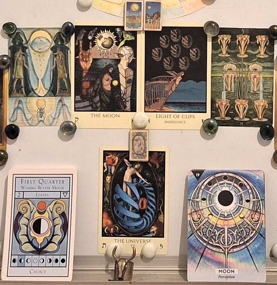 Nemia Posted February 20, 2024 Posted February 20, 2024 Thoth was my first deck and for quite some time, my only deck. I'm deeply attached to it and use it all the time. It's absolutely reliable. If you read with the Thoth, you will get an answer, and it will tell you the truth. When I started out, I had a good basic understanding of Astrology but no further esoteric knowledge. Everything I know now is thanks to the Thoth. It's not only a beautiful deck that reads precisely but also a great teacher. There are a number of things I dislike about Crowley. He writes in a style that is obscure and opaque, playing with Hebrew words and making it difficult on purpose to understand what he says. DuQuette does a good job of explaining it in clear language. After reading his book, reading Crowley is much easier. DuQuette's book is really good, but I'll look into Katz as well. However, I feel by now that the deck speaks to me personally so clearly that I read the books only for pleasure, it doesn't impact my work with the deck. I feel very comfortable with the Thoth, it's challenging but in a very good way. Another thing I dislike about Crowley is his tendency to grandiosity and his misogynist view of the feminine side of the world (or what is traditionally seen as feminine side). Generations of thinkers defined the feminine principle as dark, negative, passive, corrupting. Okay, that's how it is, I don't have to adopt that view. We all have limitations imposed on us by our cultural background and personality. You see it in his interpretation of Netzach, the realm of Venus. It's not difficult to integrate the shadow and light side and to get a more well-rounded view of these sephirah or cards Crowley tends to see as less valuable. So many newer decks have corrected or even over-corrected the preference for the masculine that it's really no problem anymore for me. Living every day with the Hebrew language, there are some GD ideas that will always puzzle me. The disconnection of Hebrew letters (which are also numbers) from the numerical values of the majors is counter-intuitive and feels wrong. How can bet mean One? Bet is and will always be Two. But the Hebrew letters are not used for counting in the deck anyway, otherwise they'd continue after Ten with yud-alef, yud-bet etc. It's a symbolic association and I can live with it. Knowing Hebrew, it also disturbs me to read words like Geburah which are impossible in Hebrew. It's Gvurah. It's against the basic rules of Hebrew to have a double letter like bet in the first syllable of a three-syllable word. (It must be a vet and the e turns into a shva). That mistake didn't start with Crowley, it simply shows that some early translators of Hebrew texts didn't have a complete grasp of the language, and I have made my peace with that. (I always write Gvurah 😉 ). Nobody is perfect, but the Thoth as a deck is as nearly perfect as it's possible for any human undertaking to be. I can only encourage Thoth newbies to jump in. Just start reading with it. As soon as you know the esoteric associations by heart, cut off the borders, or keep two copies, one with and one without the borders (or make a little cheat sheet). The beauty of a borderless Thoth where one card interacts directly with its neighbours is one of the most wonderful things you can see in tarot. The complexity of this deck is a reflection of the complexity of life and our inner being. That makes it actually easy to read with. There are so many places where you can put your hook and start to climb in. The Thoth cards have become a part of my inner landscape. My children call this deck "Mama's cards" because I keep it with me at all times. I also encourage you to study it without a book. You may find it interesting for example to take out all the cards associated with one planet and put them together. Here for example are all the cards associated with Saturn. You can feel the heaviness, oppression, the leaden atmosphere that this far away planet imposes on its cards. Another way of studying it is by looking at the major and its minors with the planetary cards that represent each planetary ruler. Here for example we have the Emperor with Mars (Tower) in Aries, the Sun in Aries and Venus in Aries. You can see how the planets influence the card further. Each card turns into a field where different influences meet. It's simply very well done, very elegant, visually compelling and complex. The Thoth is the visual interpretation of these complex relationships between signs and planets, the Tree of LIfe sephiroth and the elementary character of the suit. It all works together so well. It's a closed and logical system, like a flawless model of the cosmos, and at the same time, it's open to your personal, individual interpretation when applied to your question and the whole layout. I love this deck, and I also love the Tabula Mundi which does the same work in a different visual language. Just look at the core of my tarot calendar right now. We're in the first decan of Pisces, Saturn in Pisces, Eight of Cups, Hod in Briah. On the left, the major card for Pisces - the Moon. On the right, the minor card - Eight of Cups. The lower cards are: moon phase, planetary ruler (the Universe for Saturn) and the day (it was on Monday). A lot of Moon, and three nude female torsos on the Moon, Eight of Cups and Universe cards. The cards speak to each other, much more so than the RWS cards do. No shade on the RWS, it's a solid narrative deck and the esoteric content is hidden well. But nothing compares to Thoth and its descendant, the Tabula Mundi. It opens the door to a horary, everything is interconnected in cosmic harmony. Okay, I said too much already. Work with the Thoth, and it will reward you.