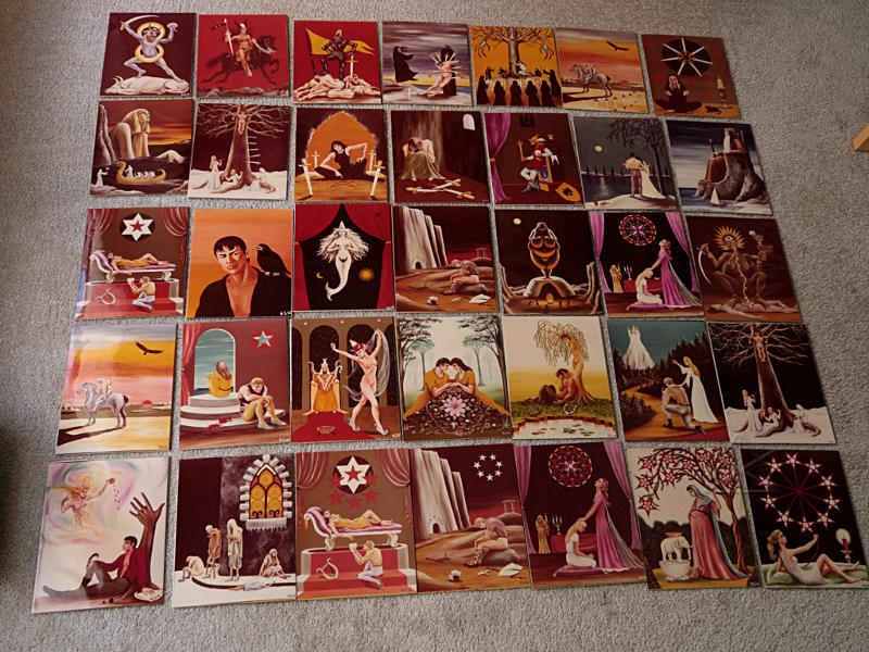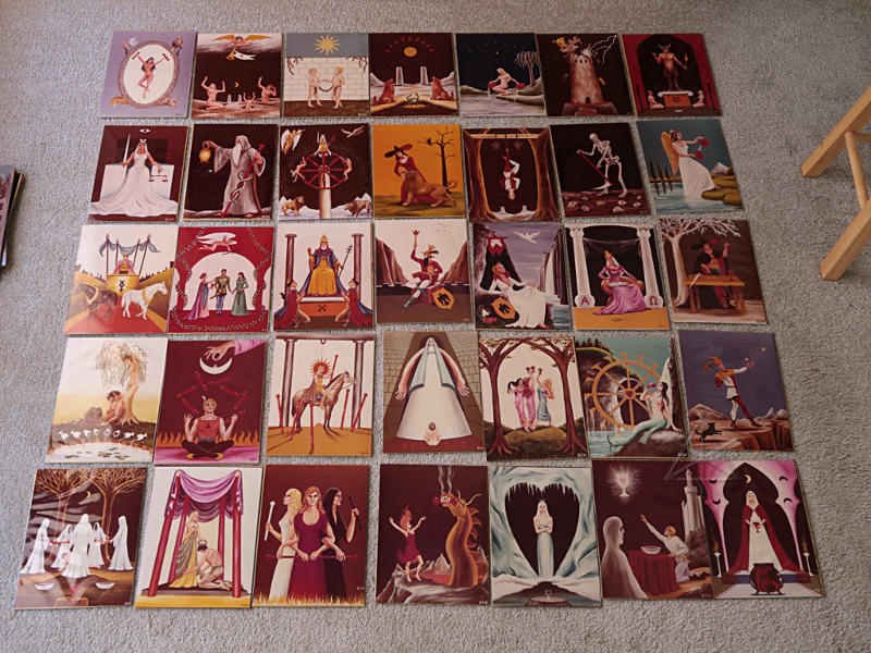 Hobbit Posted July 21, 2022 Posted July 21, 2022 (edited) In case anyone's interested, my mom still has a bunch of old proof prints of the original card artwork. (The true original canvas-boards became property of U.S.Games, and are probably buried somewhere in the same vast warehouse as the Lost Ark.) Last time I was with her I did a quick layout [definitely not a "spread"] just to see what was there. Larger images with a bit more quality/detail are hosted here . They're about 8 x 10 inches and have clear plastic protective film, but that didn't prevent the photo paper from fading and color-shifting over the years. Some are from before the pips were painted in, before they actually turned into *card* artwork. I am actually looking to pass these to a good home, rather than throw them out, unless they're just not worth bothering with. As material to display in a home, for example, they'd be a little disappointing due to condition. _H* Edited July 21, 2022 by Hobbit