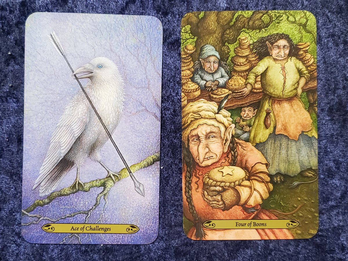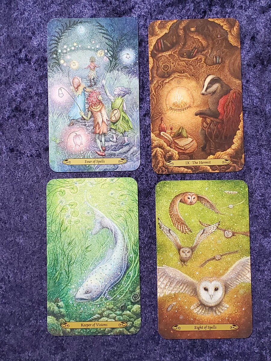 Wyrdkiss Posted August 5, 2022 Posted August 5, 2022 13 hours ago, DesertRat said: I'm liking what I'm seeing so far. That Owl card is pretty awesome. Are there many faeries? (not a big fan of faerie art) Only around 3 cards with fairies. Most depicted are humans, animals and some gnome types ( seen here). Thank you everyone for feedback on this deck. I leave you with a few more pictures.