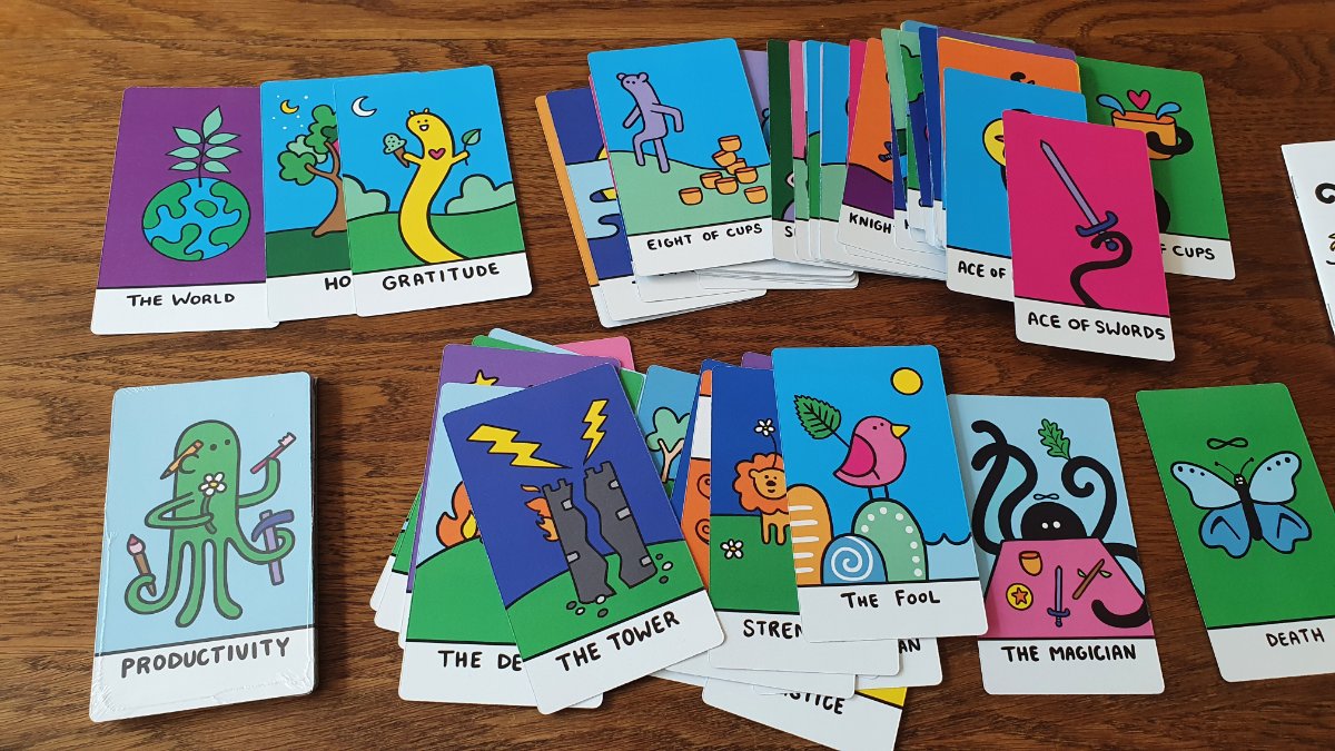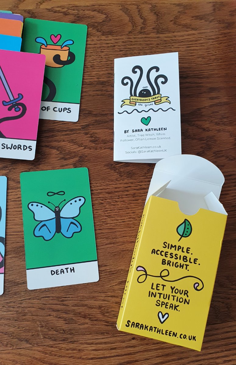 DanielJUK Posted September 12, 2022 Posted September 12, 2022 My deck came over the weekend and I thought I would take some unboxing photos and post them here on it's thread beware the cards are super cute! 😊 With the deck there was a cute thank you little card from the artist to thank all the buyers for supporting her. Also it has stickers from 5 of the deck cards 🙂 The box is super bright yellow and clearly says this is the 1st edition version.... The cards are so simplistic like you would find in a kid's book! But I think probably the artist spent hours thinking of the simple image to symbolise each card. They might be simple but it fits! It has good symbolic links to RWS ideas. In this image, top is the majors, bottom is the minors, top left are the extra cards in the regular deck. There is a sealed pack of extra oracle type cards which starts with the Productivity Octopus! The Card stock is really thick and has rounded corners. It's plastic card but not slippy, sticky plastic laminated like some RWS and other modern decks. Apparently it is "UV Plastic coated". It's Matte completely. I think it's near impossible to damage by shuffling and you can wipe them clean near kids! It has a LWB which tells you how to use it and a few keywords for each card @gregory This is the Death card for you as well! All in all, it is much more usable as tarot than I expected and isn't just super cute! 🥰
