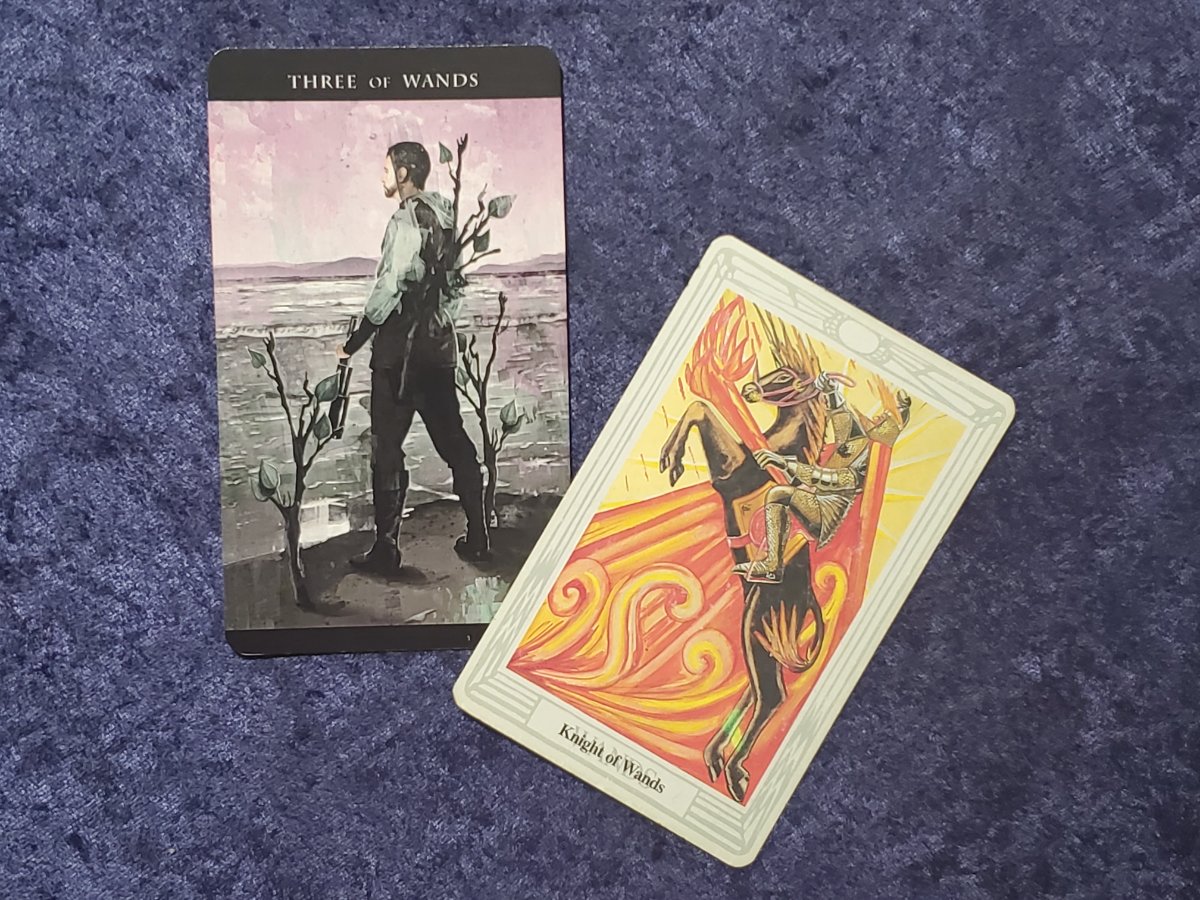 Wyrdkiss Posted August 13, 2022 Posted August 13, 2022 5 hours ago, Wyrdkiss said: What I need to move forward creatively, the next step ( Left ), planning initiated, Darkness of Light tarot. What the world needs from me at the moment, knight of wands, Thoth ( right). Execution of my vision. I will be pairing my Deck of The week with others this session. I'm quite fond of how each suite had a subtle color in the background. Note on the left the pink surrounding the image, the color for Wands in this pack.