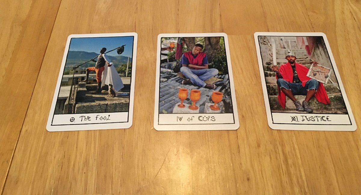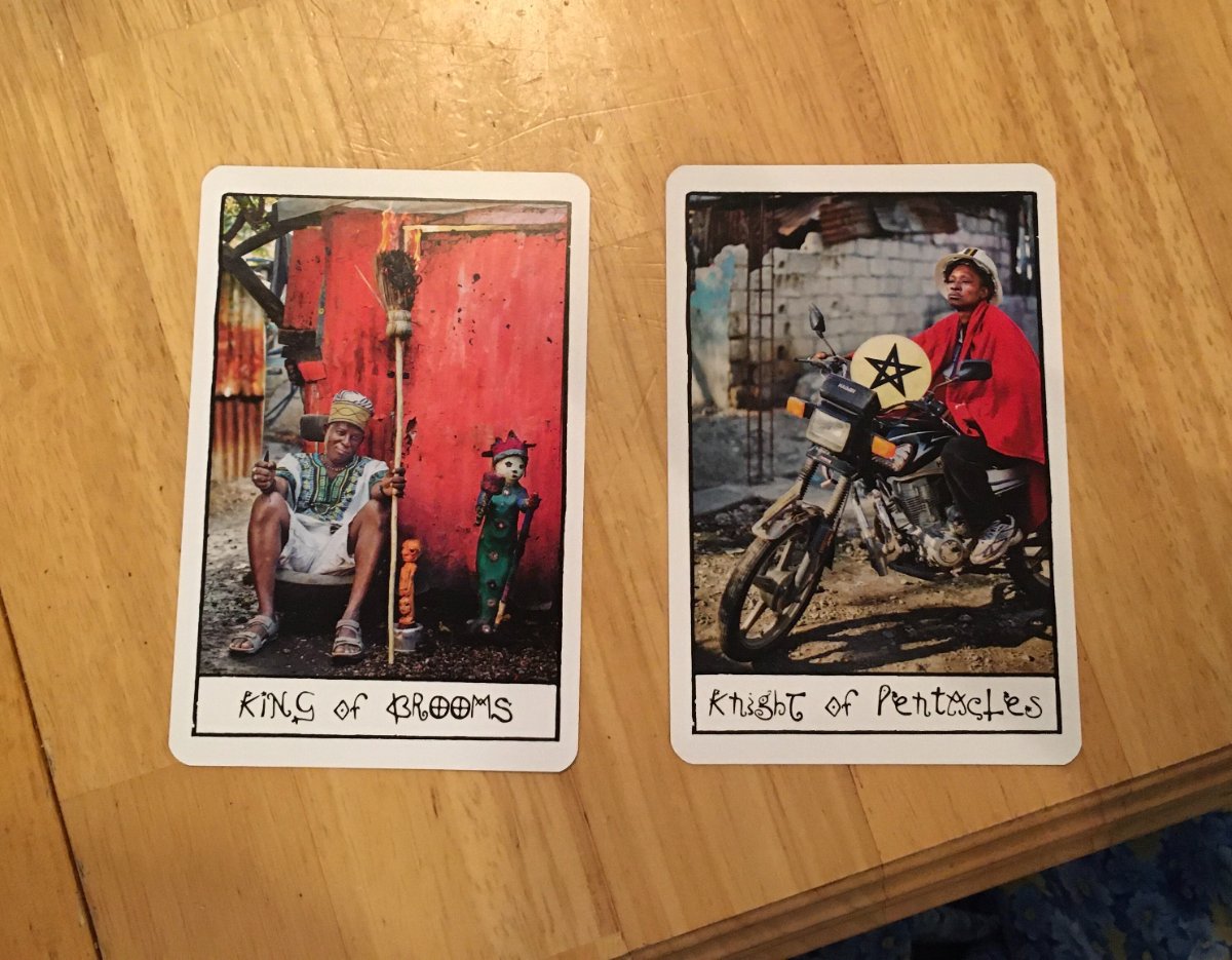 Agnes Posted August 14, 2022 Posted August 14, 2022 (edited) This is a day of firsts. My first participation in this thread, my first day really using this new deck. And I've never really done daily draws or used three card spreads, so that's new, too. On top of that, I picked up an interesting used book yesterday about using tarot for practical advice rather than predictions or working on inner growth (Janina Renee, Tarot: Your Everyday Guide) so I thought I'd toss that in there, too. When I saw photos of this deck I was smitten. Photographic decks don't really do much for me but this one sure did. But I was also concerned about lots of justice & equity issues -- the photographer is a white woman, the name really raises my hackles, etc, etc. And I'm an older white woman in the US swooning over images of poor Haitians; is this just poverty tourism? So I did a lot of reading about the creation of the deck, and I'm still doing a lot of reading about Atis Rezistans, the Haitian arts group involved in the deck. Obviously I decided I was comfortable buying and using the deck, and I don't want to derail this thread. I might write about what I've been reading elsewhere, though. The founder of Atis Rezistans Andre Eugene, who is also the founder of the Ghetto Biennale, appears only once in the deck although his artwork is in several cards. He posed for the King of Brooms (Wands), and I wanted to look at that. The brief description of the card in the LWB is "Charismatic Leader." Gifts: Inspiration, spiritual activity, a strong will, mature, passionate, vision, entrepreneur. Challenges: Tyranny, egoism, intolerance. "The goal of many leaders is to get people to think more highly of the leader. The goal of a great leader is to help people to think more highly of themselves." - J. Carla Nortcutt. Anything that you undertake with an understanding that comes from maturity will bring enrichment to your lives and to the lives of others. (Agnes here) I don't always follow LWB interpretations of cards but this is certainly an interesting way to present Andre Eugene within the deck. For my daily draw I had three positions: something to do today, something to avoid doing today, and something to think about. The cards I drew were The Fool, 4 of Cups, and Justice. Well. Something to do : be open to new experience, even if you feel foolish about it. To me this speaks to both my renewed interest in tarot (I've pretty much been away for 15 years) and to all the new experiences I listed at the top of this post. Something to avoid doing : avoid being blind to the joy of life and the things being offered. Avoid jadedness. Something to think about : Justice speaks to all the issues around this deck for me. I find it interesting to think about how this card differs from Smith's image. The machete is single edged, and it is not perfectly straight. The scales are not balanced. The sharp edge of the machete points towards the same side as the lower pan of the scales, and that wall is stained and reddened. The LWB doesn't suggest that any of this is intentional but it's what catches my eye today -- justice that is not evenhanded. Renee's book is not one I'd heard of before. I haven't read reviews yet but found it an interesting read. She basically suggests that you ask for specific things to do, and that the cards you get will demonstrate a way to act. She writes about mimicking the poses in the cards, etc (and about how to adapt her WS-heavy interpretation to other decks). It's intriguing but will it work? I asked two questions about a specific discussion I'm having with a person in my life who is very dogmatic and defensive. Is it a good idea to continue this specific conversation? And if so, how can I best approach it so we can talk about this topic but not just call each other names? Well, look who showed up. (I promise I shuffled a lot!) My first reaction to the King of Brooms is : he looks chatty. Renee's book says that court cards represent "modes of thinking and acting that you can adopt in order to deal with different situations." She says that this king is very active & decisive, a take-charge guy, but also that he is a good communicator. I'm taking this as a yes, keep talking. My second question was how to do so productively. I don't really get any intuitive message from the Knight of Pentacles. Renee says, go ahead with your plans but proceed slowly and cautiously to minimize risk. Emphasizes commitment to something long term and to efforts that create structure and order. In this particular situation I would say it advises me to keep in mind the long term structure of this relationship. The face of this knight really strikes me -- he looks closed off and perhaps suspicious. I hope this isn't me and it pretty much is my conversation partner. Maybe I need to keep that in mind in our conversation; what I say is not going to be received with the open generosity of the King of Brooms. All in all, this seems quite interesting. Edited August 14, 2022 by Agnes