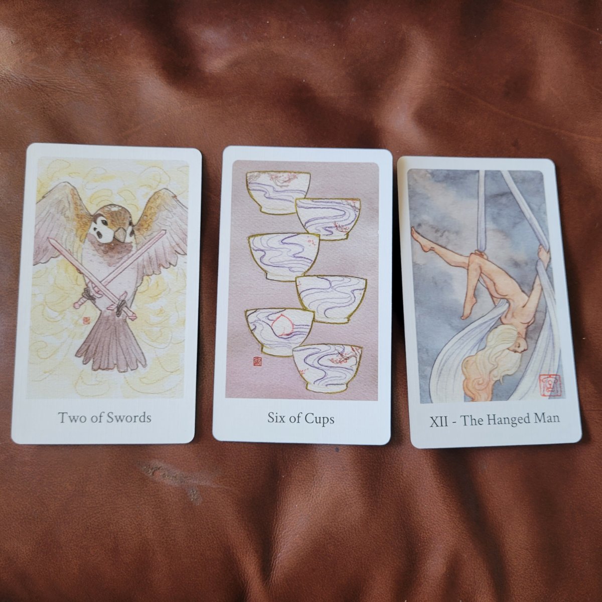 Jadis Posted August 21, 2022 Posted August 21, 2022 I backed this deck on kickstarter a few years ago because it was really beautiful and was from a local artist, but from the first day I held it I didn't feel a connection. I never really worked with it past that first time so I'm hoping this week will show me if I should rehome it or not. Today's spread: I like the 2 of Swords here, to me it really empathizes having to think quickly while juggling difficult decisions. For the 6 of Cups I was drawing a huge blank. I couldn't pull much from this image personally so I looked at the booklet and it said this card represents childhood memories and revisiting the past. The booklet is really spare on description and wish it had more insight than that. I found this version of the Hanged Man to be very evocative and striking. I liked the feeling it gave that the Hanged Man could choose to anchor himself more securely or drop down easily as he is fully in control of his placement.