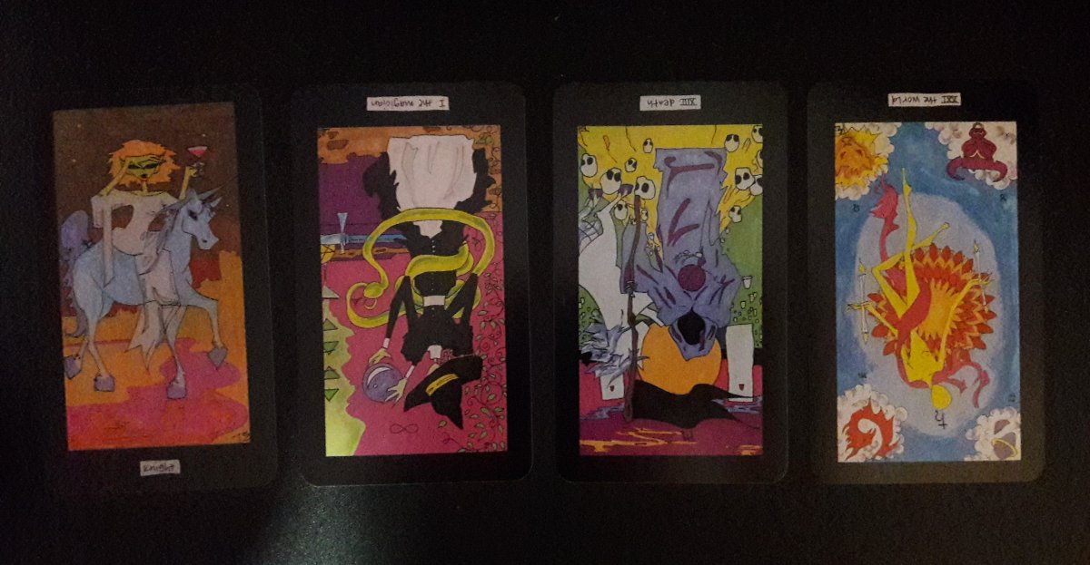 Agnes Posted August 24, 2022 Posted August 24, 2022 Alleyman's tarot, day 5. I've been splitting this deck up into parts to study in different ways -- the majors, the minors, the additional minors, the "other arcana", reading the handbook and comparing it to some of my favorite authors, etc, etc. I do feel like I'm getting more of a grasp of what the creator was trying to do, and how the deck might work for me or others. But I'm still wondering whether I actually want that. This deck veers very far away from the idea of 78 cards that emcompass all of human experience. Many cards split off aspects of one card -- say, taking the 6 of cups and adding a card that's all & only about nostalgia for the past and how it can be good or crippling, instead of leaving that as an aspect of a card that could deal with the past & childhood in different ways. Others split off aspects of the court cards into separate personalities. I am not sure this specificity is really helpful but also I find reading the handbook thought provoking. If I continue to work with this deck, I'll want to retitle a bunch of cards and replace others whose images I just don't like. I might also just remove some of the cards but I think I'd be a little slower with that before deciding to throw out concepts the author wanted to include. This is definitely a deck with a bias against authority. The handbook really rips up kings, generally painting them as despots reveling in unearned authority. Sometimes the reversed definitions are the more standard ones; sometimes they become even more perverse characters. But then of course there's a hole in the deck : how do you represent someone who embodies the traditional King of Swords if your definition is this? Here it's pretty much the reverse of the King, but elsewhere the traditional concept has just been removed entirely. I'm trying to find these holes and see if they're represented elsewhere in the deck. (I call this card : "if Elrond was a serial killer") My feeling right now is that this deck might be great for pulling a card or two at a time, to shed some light on a situation or to give you something to think about, but I'm not sure about larger, more nuanced readings. I guess there's an obvious way to explore that! Here are three cards of the cards I'd like to retitle. I'd appreciate suggestions for ways to do so without just crossing out one title with a sharpie and writing in the other. The card on the left has no title, so I can just remember the one I'm calling it (and alter it in the documentation). But for the two with titles on the cards, I'd appreciate suggestions for ways to cover over the existing titles or cross them out in a more decorative way. (I want to use that Fool as the Performer, and the Queen of Wands as my Knight of Wands. There's another fool and another queen of wands in the deck, and I don't want to confuse myself when these turn up.)