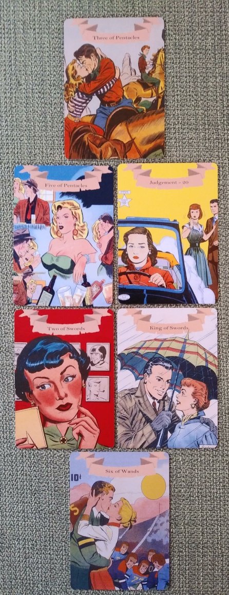 Rachelcat Posted August 27, 2022 Posted August 27, 2022 This week I’ll be using the Golden Age of Romance Tarot by Bobby’s Tarot Decks on Etsy. It’s made from covers of 50s-60s romance comics. Yes, there were romance comics! I got the poker-sized version which comes in a little plain bag. Cute backs! Obviously, we’re not going to see much diversity here, but I’m thinking there might be some unintentional humor a la the Housewives Tarot. And I’m not sure how the romance theme will work with readings for myself. Let’s see this week! Interview time! Wash and shuffle! Most important characteristic: Six of Wands It’s a winner! The players are smiling, maybe making fun of the happy couple, but also happy for them. Even at this winning moment, Ms. Cheerleader still grasps her megaphone. Strength: King of Swords This clever and forward-thinking gentleman has remembered to bring an umbrella, to the benefit of the young lady. The deck is clever in its attributions. It’s not just a gimmick, it makes a real effort at adding meaning through the illustrations. Weakness: Two of Swords More football! She’s making a considered decision between the footballer and the pipe smoker. Oh, wait, she has another photo in her hand, and more on the wall behind her. This decision is broader than between two, but I guess it’s good she has such a large field to choose from! With this deck we’re spoiled for choice? Maybe too many cards are similar? What I can learn from the deck? Judgement I can learn to rise above the seemingly petty concerns of the comics and get a glimpse into real life situations. Is the woman choosing between the man and her friend driving away? Or is she coming to some higher realization that she is going to face consequences for what she’s chosen to do? How can I learn it? Five of Pentacles Here’s a stereotypical bad girl, drinking too much, hanging out with the wrong men. Which one led to the other? And she definitely isn’t happy about it. Which ties in well with the previous card: I can learn that actions have consequences. Some things, like gambling and drinking, are considered immoral for a reason, even if they’re thought of as “victimless crimes.” Often they hurt the person doing it most of all. Outcome of our work together: Three of Pentacles Ok, this one kind of breaks the RWS mold. Three people, check. Out doing something pretty earthy, riding horses, check. This means what you see is what you get: the outcome is I will get out of it just what I expect, romance, fun, some real meaning. And some people won’t be happy with that, like the looking-on young lady! Well, that was fun! Let’s see what happens with using the deck for my new moon reading!