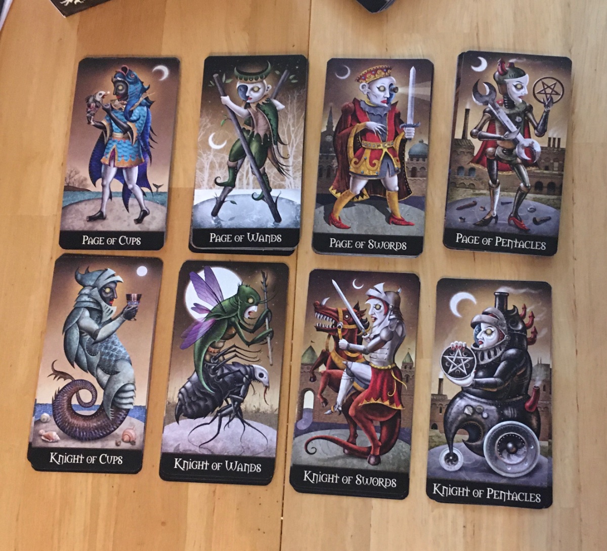 Agnes Posted August 28, 2022 Posted August 28, 2022 19 hours ago, fire cat pickles said: Deviant Moon it is, ma'am... (Suddenly I feel like a bartender!) Well, this deck is a pretty heady drink. I’ve been looking at the cards — in order, randomly, in different orders — and just floating in them. So many amazing details. Such provocative images! I wish they were four times as large. I’ve also been reading the companion book. I like seeing alternate versions of the cards and learning something about the creation of the images. I appreciate reading the meanings Valenza intended for the cards but expect that mine will shift some — and it’s nice to read that he expects that to happen. Look at these pages and knights. Aren’t they amazing? And here is the 10 of cups. All four suits are incorporated, which really intrigues me.