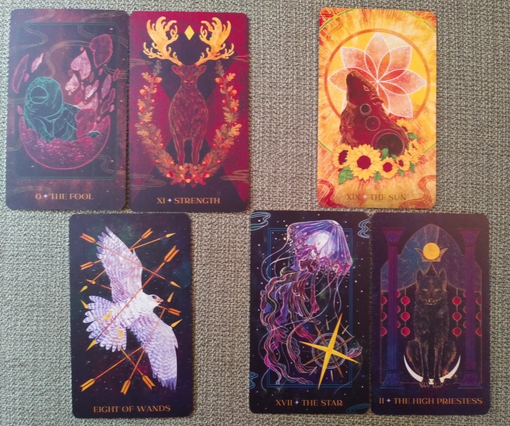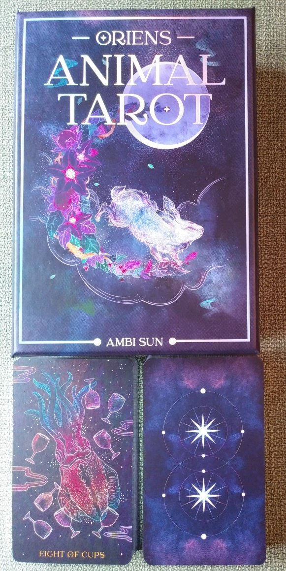 Rachelcat Posted September 25, 2022 Posted September 25, 2022 This week another animal tarot, Oriens Animal Tarot, published by Rockpool. As you see, the backgrounds of the cards is black. It’s edged in silver and the box has silver spots, but the cards don’t have gilding on the faces or backs. Oriens is Latin for east, and the artist-author relates it closely to the rising sun. The backs are a pair of compass roses. A quirk of the book is that the sections of info about the species are separate from the card interp section. Justice is VIII, Strength is XI. It interesting that the animal attributions aren’t closely tied to the elements of the suits, that is, not all swords are birds, and not all of the cups are animals that live in water, etc. I guess they have a stronger relationship to the meanings than the elements? We’ll see about that. I’ve attached a list the attributions. Wash and shuffle and interview! All but one is a major! I swear I shuffled! Most important characteristic: Eight of Wands, peregrine falcon The deck connects quickly, and is helpful with planning (8=mercury + wands=action). A falcon can quickly avoid arrows aimed at it, but this is a lot of arrows! Strength: Strength, reindeer Ok, strength is strength! The deck has its own power and isn’t afraid to be different. A reindeer is pretty strong to pull a sleigh. Weakness: Fool, baby sea turtle The baby turtle is just starting his life, coming out of his egg. This isn’t a deck for beginners? Or maybe it goes its own way a bit too much for easy understanding. What I can learn from deck: High Priestess, Wolf Love her pomegranates! I can learn quiet inner wisdom, rather than rote tarot knowledge. How I can learn it: Star, jellyfish By letting it be a blessing to me. Just be open to the good. So this is a bioluminescent critter? I never thought of a jellyfish as beautiful (more weird), but this one definitely is, appropriate for the star. And the compass rose/star makes another appearance here. Outcome of our work together: Sun, capybara The rodent of unusual size! It really does look like it’s soaking up the sun and enjoying life! The deck and I will get along and have fun and read about the good things in life! Well, that was fun! I’ll be back with my new moon reading this afternoon. Oriens Animal Tarot.pdf