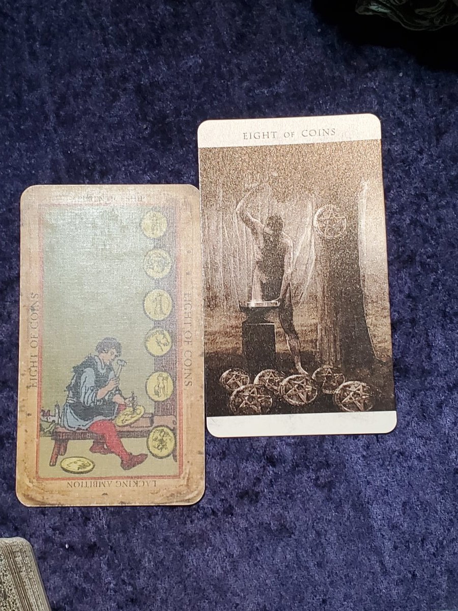 Wyrdkiss Posted October 17, 2022 Posted October 17, 2022 (edited) I've always been fond of this pentacles card. It's tangible, a positive reminder. I'm still torn as to which deck to bring to a faire I am reading at in November. I like the darkness of light images more, but I'm running out of time to study a few evasive card meanings. Those keywords are a good jumping point, but I think most sitters will like the DoL better. Note: I will definitely also have my Thoth, and probably use that for at least half the querents. I can tell, upon saying hello, who is meant for an RWS style. Edited October 17, 2022 by Wyrdkiss