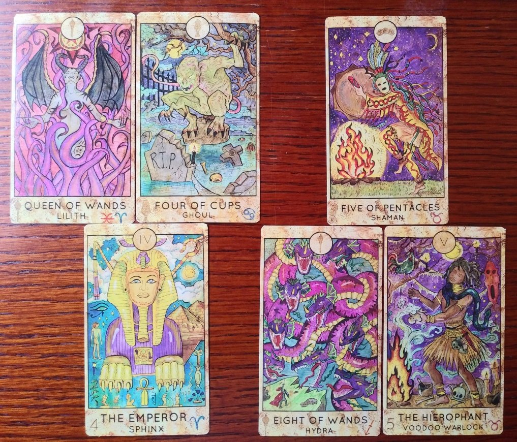 Rachelcat Posted October 23, 2022 Posted October 23, 2022 This week I’ll be using Spirit Tarot Cards. (That’s what it says on the front of the box.) I got it from the trade table at NWTS. It’s from Spirit Halloween, a company that sells costumes, so the theme make sense: Each card has a monster or character, which I guess you could choose to portray in costume. I think the attributions are pretty good, as is the artwork. The only character I’ve never heard of is Genny Greenteeth, so one to research. On to the interview! Most important characteristic: Emperor, Sphinx The deck is “traditional” and puts itself out there as a legit tarot. Which I think it is. I like the accuracy of the crook and flail symbols for kingship here. Strength: Four of Cups, Ghoul It’s good at getting the creepy Halloween vibe going. Again, as the 4 Emperor, it’s traditional, holds to established tarot meanings. Weakness: Queen of Wands, Lilith Because of the Halloween theme, it doesn’t show many positive characters, including female characters. A powerful (wands) woman (queen) isn’t always a monster! What I can learn from deck: Hierophant, Voodoo Warlock More tradition. The deck can be a starting point to learning more about the characters herein. Voodoo is about more than dolls, but I need to learn about that. How I can learn it: Eight of Wands, Hydra Keep trying! The heads keep growing back, so keep cutting them off! Or, on the other hand, try something different because cutting them isn’t working. In the end, the hero cut off the heads and a helper cauterized them. Oh, ok, teamwork! I can learn from the work and study of others. Outcome of our work together: Five of Pentacles, Shaman And here’s a 5 connected with Hierophant rather than loss. Unless it refers to a loss of indigenous culture? And his drum is a giant pentacle I guess. The readings will be about non-material issues, not (5) health and wealth (pentacles). I didn’t realize we have astro signs throughout. It looks like just signs, no planets, and courts have two signs. The majors here look like Golden Dawn. I’ll have to go through the deck and check the attributions. Because I want to! On to today’s reading shortly!
