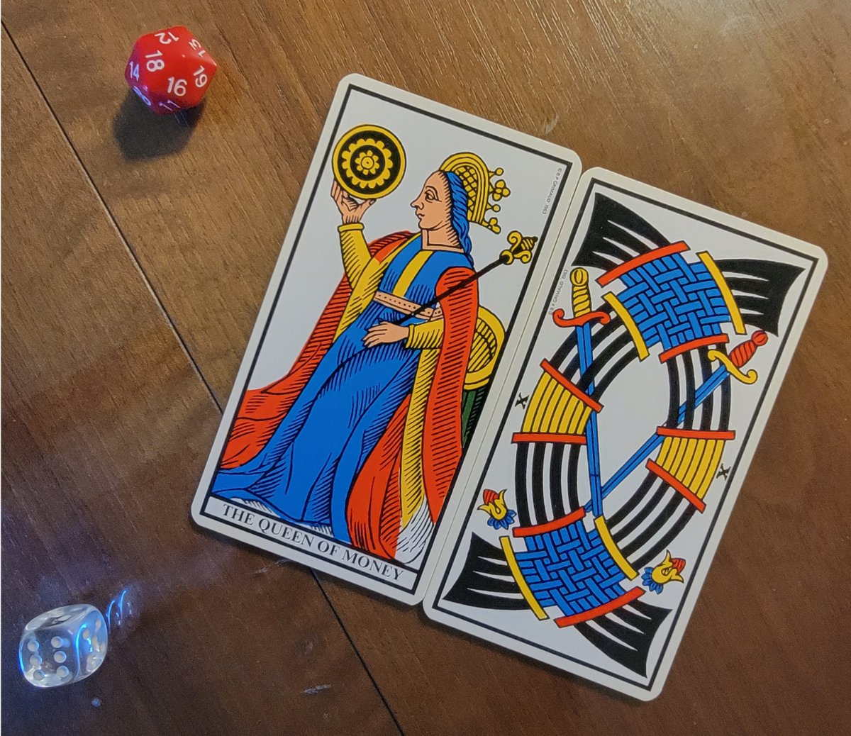 fire cat pickles Posted October 21, 2022 Author Posted October 21, 2022 (edited) Rolling my 20-sided die and adding my 6-sided die gives a sum of 26. I then multiply this sum by 3 to get a product of 78. After "shuffling" the cards (and by this I mean scrambling the cards out on my huge, round glass coffee table) and re-stacking them, I counted through the cards and chose the appropriate ones after rolling the dice. My products were 75 and 60. (I got "60" twice!) I have a separate list of tarot cards numbered 1 through 78. On this list, Page of Pentacles is 75 and 10 of Swords is 60. After rolling the dice and adding and multiplying, the cards I drew were Queen of Pentacles and 10 of Swords. In addition to drawing the cards, the cards I have now are a close match with one card and an exact match with the other. Not only is 10 of Swords "60" on my list, I rolled "60" twice. But I'm not too worried about this because when I read 10 of Swords in TdM it is "Earth" not "Air." It doesn't carry the negative connotation that it does in RWS... I just wanted to share the method(s) I'm using with my readings this week, and possibly next week. I will probably be figuring in the dice numbers and "extra cards" in my readings as well. Edited October 21, 2022 by fire cat pickles