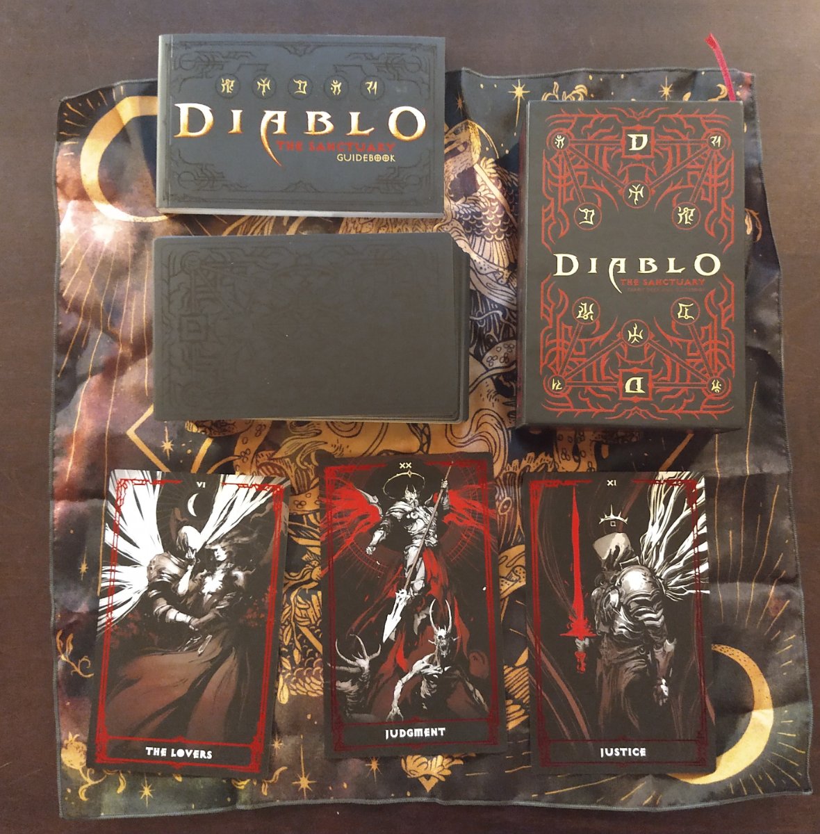 Niobium Posted December 31, 2022 Author Posted December 31, 2022 Received the Diablo deck for Christmas, finally had a moment to open it today. It's H U G E. (Ellis Deck 5th Ed. Plastic for comparison.) When I opened the box and took out the book I just stared. I was expecting the usual, you know, a standard or small deck in a cardstock platform. No! The deck is the size of the box itself. Matching the Game theme to the cards is very hit and miss. Some are really good, others are a bit :squint: worthy. Pictured here are some of the really good meaning/character matches: Tyrael, the Angel of Justice, as Justice, and his office is a theme in the story; Imperius as Judgment, who is in fact the Angel of , and his game theme is a nice match. The Lovers are Inarius and Lilith, a demon and an angel whose love causes the creation of an entire race. They create a world, Sanctuary, in which to be safe from their respective sides (which is depicted in the World card, and Inarius is the Emperor while Lilith is the Empress). Barbara Moore did the book, which is well written though as one night expect plenty of the images don't match the meanings. A shame, as the product is otherwise so well made I feel it wouldn't have been an extra step to find better matches for, example, the King of Pentacles, etc. IMO, like the Mage the Ascension deck, a very good Game Deck but maybe not for tarot proper. Much better quality than many of the other, recent run of IP decks. Illustrated Minors, anyone? All the cards are red foiled and the back is a spot UV design. It's available with the book for about $40US and without the book for $20US.