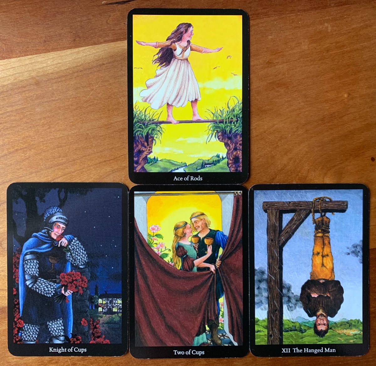 FindYourSovereignty Posted November 30, 2022 Posted November 30, 2022 (edited) Get to know my deck Spread by Mary Greer What do I most need to be aware of: 1. An area of focus, general atmosphere or the overall energy at play. Ace of Rods Balancing my ambitions, my commitments, my ideas and inspiration is important to be aware of today for the commitment I make I take to heart as required. My past conditioning taught me that my identity is wrapped around what I commit to and follow through on “you cannot quit”. I know this is not true, but, energetically, it affects me. This is reminding me to be selective of the many desires I have, they are all healthy and viable options, and focus on the one that supports me in loving myself. 2. This is the part of myself that is most active and of which I need to be most aware. Knight of Cups Supporting the Ace of Rods, actively loving myself and taking the actions to both support and protect my heart is important today. I am out and about today in an environment where I could feel judged and this a reminder to believe in myself and protect my feelings. 3. This is the situation that the part of myself (Court Card above) is concerned with today. Two of Cups Another confirmation of needing to protect my heart and my self-love. What I keep inside, protected and under cover needs to know it can trust me to put my heart first when I am around the company of others. Everyone benefits when I take care of myself first and then I am in a stronger place to serve others in a healthy way. 4. This shows why I need to be aware. The Hanged Man Today is a tested day for me and I need to be able to pause before I speak, to observe others and give them the space they need to be themselves. It is literally a dreary, rainy day here and, I am teaching a knot-tying class. Coincidence? I think knot (pun intended!) 🤷🏻♀️😂 These cards numerology total 15 = The Devil reminding me of the temptation to overcommit and put others before me in order to be popular and buy love and affection and 6 = The Lovers - love of self must come first or I’ll fall into the addiction of self-sacrifice. Edited November 30, 2022 by FindYourSovereignty Add photo