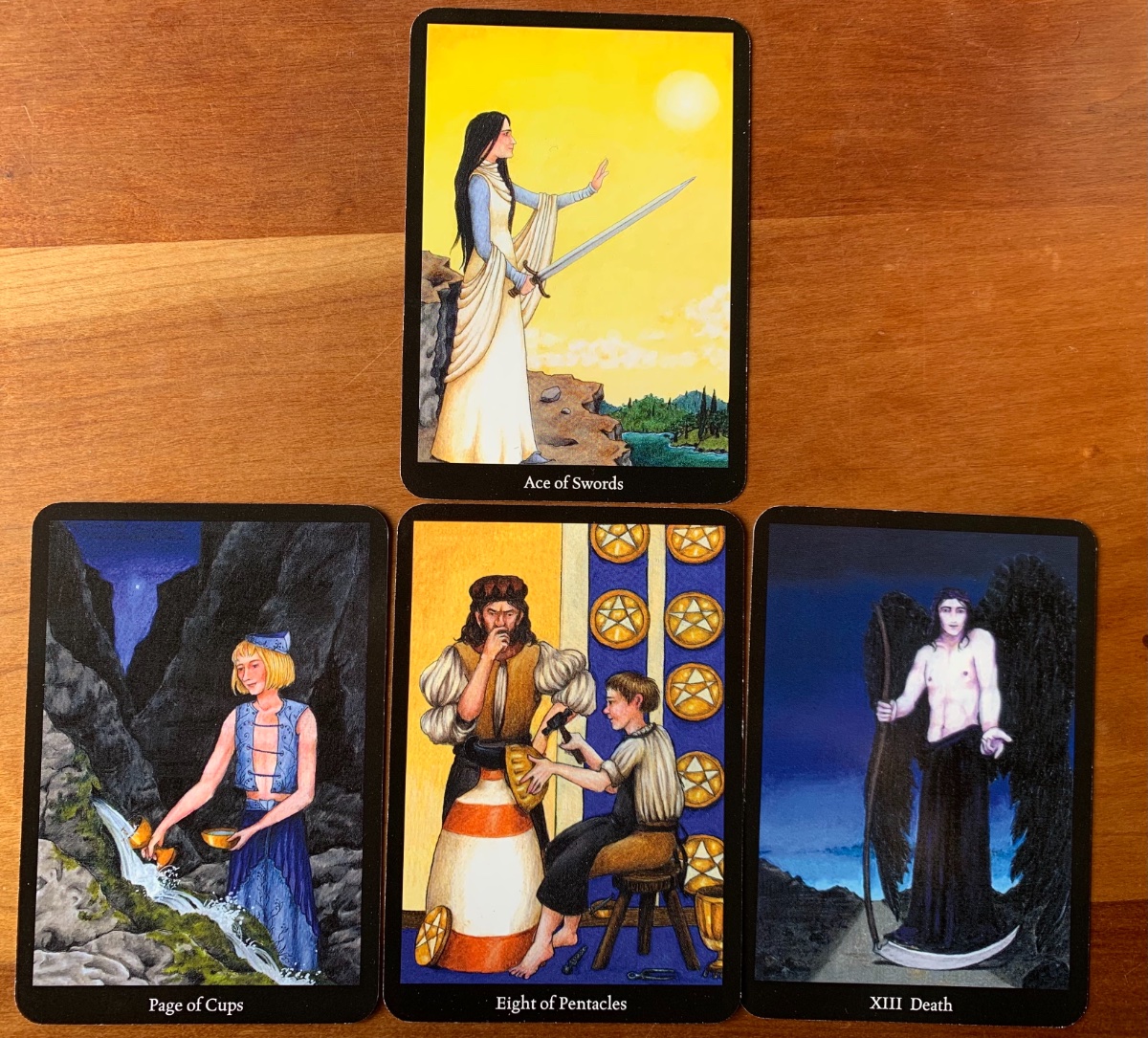 FindYourSovereignty Posted December 2, 2022 Posted December 2, 2022 (edited) Get to know my deck Spread by Mary Greer What do I most need to be aware of: 1. An area of focus, general atmosphere or the overall energy at play. Ace of Swords Repeat from yesterday, however today’s energy is manifesting and I feel today this card is telling me to send out my desires and trust without question I will receive them. They are meant for me and mine for the taking if I am willing and able to receive. 2. This is the part of myself that is most active and of which I need to be most aware. Page of Cups Filling my emotional cup, knowing that my cups are full and how to fill them, and trusting there is plenty more for me to experience is what I need to be aware of today. Observe all that is presented, soak it in and squeeze out what doesn’t work for me. 3. This is the situation that the part of myself (Court Card above) is concerned with today. Eight of Pentacles Maybe my mentor is going to present themselves today or maybe this is about me teaching others. Either way will assist me in becoming better and improving my skills. 4. This shows why I need to be aware. Death Something is ending today that is no longer serving me. Whatever dark cloud that has been holding me back, expires today as there are bright blue skies in my horizon. Today I will benefit from sending out to the Universe what I wish to receive and expecting without question that I will receive it in an even better way than I could ever imagine. I did ask for a mentor yesterday to continue this flow of learning I am on in a more guided way; one that will perfect my abilities and bring me confidence. My lack of confidence and current way of learning is over, I am open to walking a new path, trying a new approach. Blues and yellows dominate the cards today. Another repeat from yesterday. And yesterday was an amazingly successful day. I spoke my truth and it brought me much joy. Numerology is 22, my master number of Grace. We’ve had a lot of interesting 22° planetary energy this year. Reduces to 4 = The Emperor embodying all the balanced energy of the 4 Kings. Edited December 2, 2022 by FindYourSovereignty Add photo