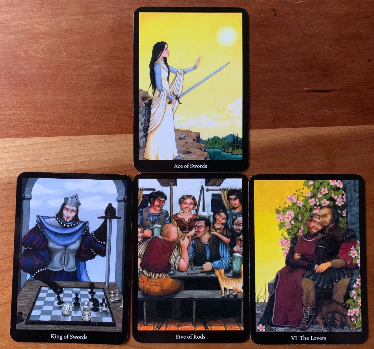 FindYourSovereignty Posted December 1, 2022 Posted December 1, 2022 (edited) Get to know my deck Spread by Mary Greer What do I most need to be aware of: 1. An area of focus, general atmosphere or the overall energy at play. Ace of Swords Being alert and aware, using all of my senses to receive and be prepared for everything that comes my way. Be a human antennae tuning into the highest frequency. 2. This is the part of myself that is most active and of which I need to be most aware. King of Swords Trusting and knowing what I am responsible for, I will only make the necessary moves or take any actions that are for my Highest Good and the Highest Good of All. 3. This is the situation that the part of myself (Court Card above) is concerned with today. Five of Rods Honing in on and enhancing my abilities through practice and challenge with those that want to help me grow. People that want to see me get stronger and more confident. 4. This shows why I need to be aware. The Lovers Today is my 33rd wedding anniversary. The more I live authentically, which is the work I am doing, the happier we both we will be as we grow old together. Loving myself let’s me love him in the healthiest way possible. Today’s energy in the cards feel fairly balanced to me. There is individuality as well as community and connection. The most dominant colors are blue (air/throat chakra) speaking my truth and yellow (fire/solar plexus) and feeling my truth are going to lead me to the most loving actions to take. The numerology totals 12 = The Hanged Man and 3 = The Empress. Both cards I’ve had this week already. Continue to receive and be open to new perspectives and seeing the many options to nurture myself. They are in great abundance. Edited December 1, 2022 by FindYourSovereignty Add photo
