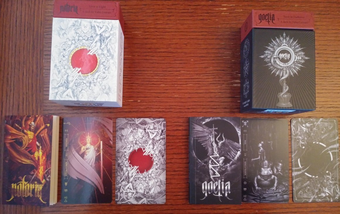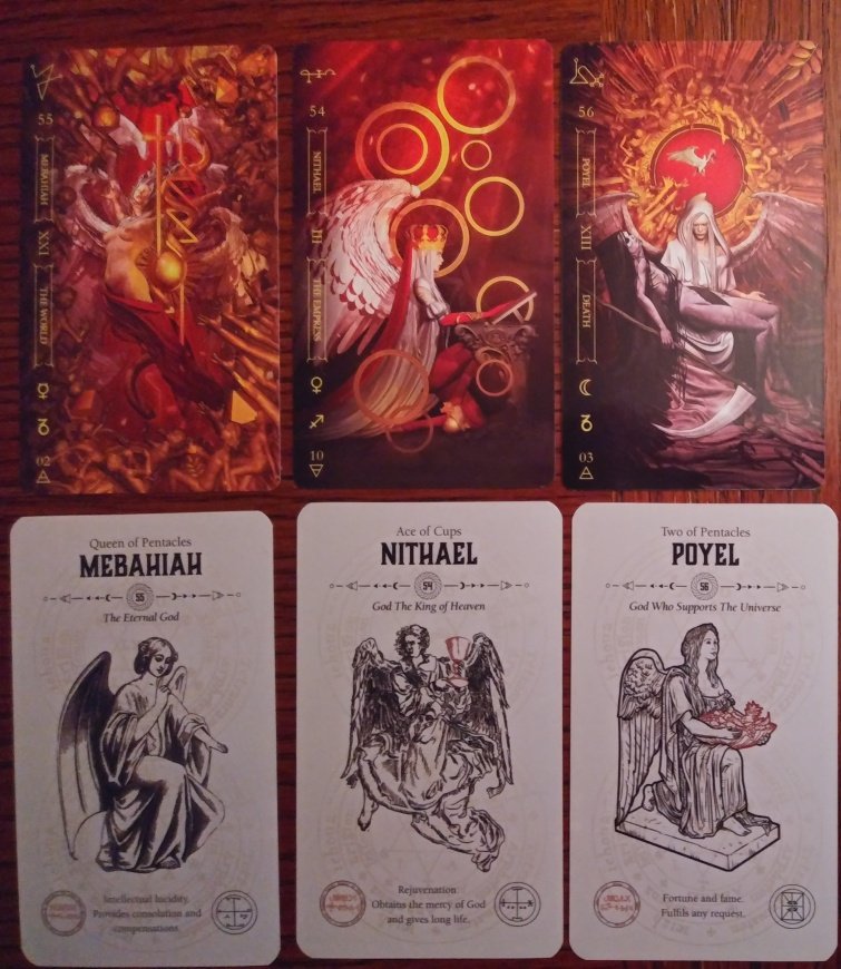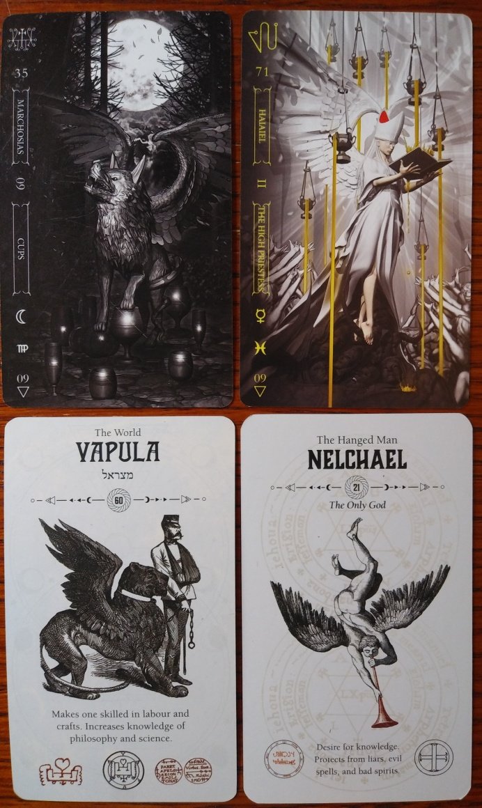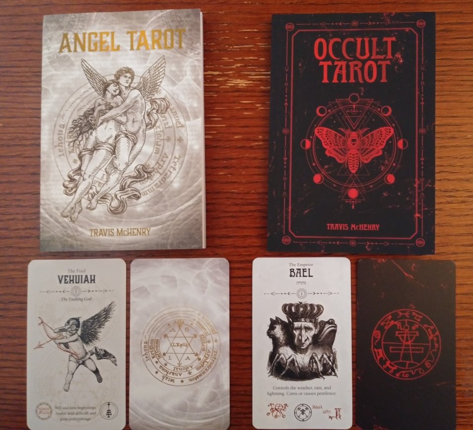 Rachelcat Posted December 11, 2022 Posted December 11, 2022 Hi, DOW crew! Here I am! Late as usual! And I’m going to bore you all with my angels and demons saga. I’ve been collecting and trying to get just the right shemhamephorash/72 angels and their demon counterparts in card form for a long time now. There was a long out of print Lo Scarabeo angel deck I probably shouldn’t have let go. I recently let go of the Demon Tarot, based on the Dictionnaire infernal by Jacques Collin de Plancy, illustrated by Louis Le Breton (which isn’t quite the right 72 demons) and Fallen Angel Oracle, which is. (I might grab that one back.) I also let go of a Spanish-language angel deck but will keep forever the Tarot Cabbalistique, with illustrations that allude to famous artwork corresponding to the 72 angels. The decks I’m going to be talking about this week are the Notoria: Tarot in Light and Goetia: Tarot in Darkness by Fabio Listrani, Lo Scarabeo, and Angel Tarot and Occult Tarot by Travis McHenry, Rockpool. Both sets have tarot attributions (“intuitive” as far as I can tell, not following a system) to the angels and demons, necessitating 6 extra cards each. But my intent was always to ignore the tarot attributions and go straight 72 names. I’ll use The Complete Magician’s Tables by Stephen Skinner and Birth Angels by Terah Cox for reference. I’m currently (again) working on a comprehensive angel table. I like making tables, what can I say! I’ll post it on the forum when I get it all together. The Goetia (demons) looked cool on line, but when I got the deck, I realized the colorful cards were a special Kickstarter edition, and the mass market deck is more monochromatic, white and silver on black. I recently got the Notoria (angels), and I don’t think I can use it. The artwork is just too, um, challenging for me! I mean demon illustrations should be creepy, but angels not so much, according to me anyway. So I pulled the trigger on buying the McHenry decks. The Occult also uses the Dictionnaire infernal illustrations with the gaps filled in with similar woodblock-style illustrations. The Angel is illustrated in the same woodblock style, but it doesn’t give a source for the images. Both also have sigils. They have lovely presentation, Occult deck is edged in shiny red, Angel in gold. The Occult book is disappointing because it has exactly the same text as the cards! The Angel book has more information, probably because more is available about angels than demons, but there are formatting errors. If you’ve stuck with me this long, may the angel and demons bless you! Finally, here are some pics. Let’s do one card from each deck for interviews (leaving in the extra cards). Tell me about yourself. Notoria: 71. Haiaiel Next-to-last angel. “Dominates weapons and soldiers, influences iron.” Mercury in Pisces. This is a deck that doesn’t play around. Mercury in Pisces means it knows how people feel and communicates desires. It illustrates the Priestess and people reaching out for her wisdom, but why are all her cups overflowing? Goetia: 35. Marchosias “She-wolf with gryphon’s wings and serpent tail.” A fighter. Moon in Virgo. The deck may look fierce, but it can be loyal like a dog. Angel: 21. Nelchael “Desire for knowledge. Protects from liars.” This is a good deck for learning more about angels. Occult: 60. Vapula “Increases knowledge of philosophy and science.” An interesting thing I forgot to mention about this deck is it has the Hebrew name of the corresponding angel, but the Angel cards don’t have that. Strange . . . Another griffin, this time a more “griffin-y” one, a winged lion. This is also a good deck to learn with, but it doesn’t require belief. It will help me be more skeptical, not less! Well, that’s enough of that! I hope four decks in one week is ok for the thread. Not sure it’s ok for me! Now off to do my moon days for yesterday and today.