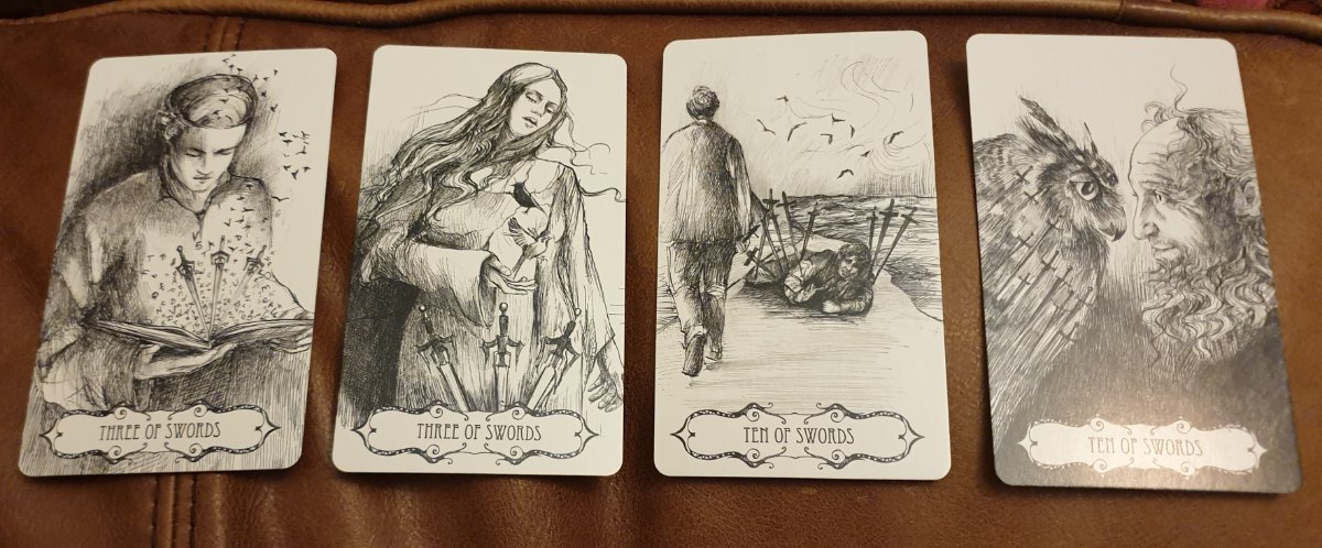 Scarlet Woodland Posted December 12, 2022 Posted December 12, 2022 (edited) Okay, I love both these decks. I've worked with the Hush Tarot just enough before this, to know that it reads well for me and I think the artwork is gorgeous. I'd love to know more about his painting process, it looks fascinating. Also look at that wee ferret 😻 Tarot of the Abyss has future top 10 deck written all over it. I'm so happy I took the plunge and bought it. The two alternate cards are a really nice touch. As you can see on the bottom right of the pic above, I decided to go with the alternate 3 of swords, as it offered a little something extra and just spoke to me. Have stuck with the traditional 10 of swords though, as the alternate is very much a numerological interpretation, which isn't how I read the 10. Beautiful backs on this deck too. Edited December 12, 2022 by Scarlet Woodland