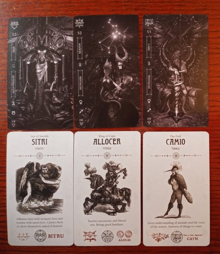 Rachelcat Posted December 15, 2022 Posted December 15, 2022 Thursday Day 23, Wisdom and Surrender Paired demons Where I need to have faith and trust that things will unfold as they are meant to: 12. Sitri Inflames love between men and women. Leopard’s face and wings on a beautiful human. Jupiter in Taurus. Love and relationship issues will happen if they’re meant to, or not if they’re not. If it happens, physical attraction will play a large role (Jupiter in Taurus, and I think it means that when it says “love of men for women and vice versa.”) Something reassuring I know deep inside: 52. Aloces A duke wearing a crown. (Book says riding a griffin, but both cards have him riding a horse.) Teaches astronomy and liberal arts. Mercury in Sagittarius. Learning is its own reward. And takes you places you don’t know you were going (Sag.). It can even lead to a natural superiority (duke). How I can tap into my higher wisdom: 53. Caim A thrush, then a man with a sharp sword. I love the man in the bird suit, I guess his sharp sword is his costume beak! The other looks more like an eagle, with a big sword entwined with snakes. Teaches the languages of animals. I can listen and learn from birds. Not my favorite animals, but I should be more open to them. Ok, this was easier, with input from both decks and the Magician’s Tables book. I’m still not really reading the images, but at least I’m looking at them more!