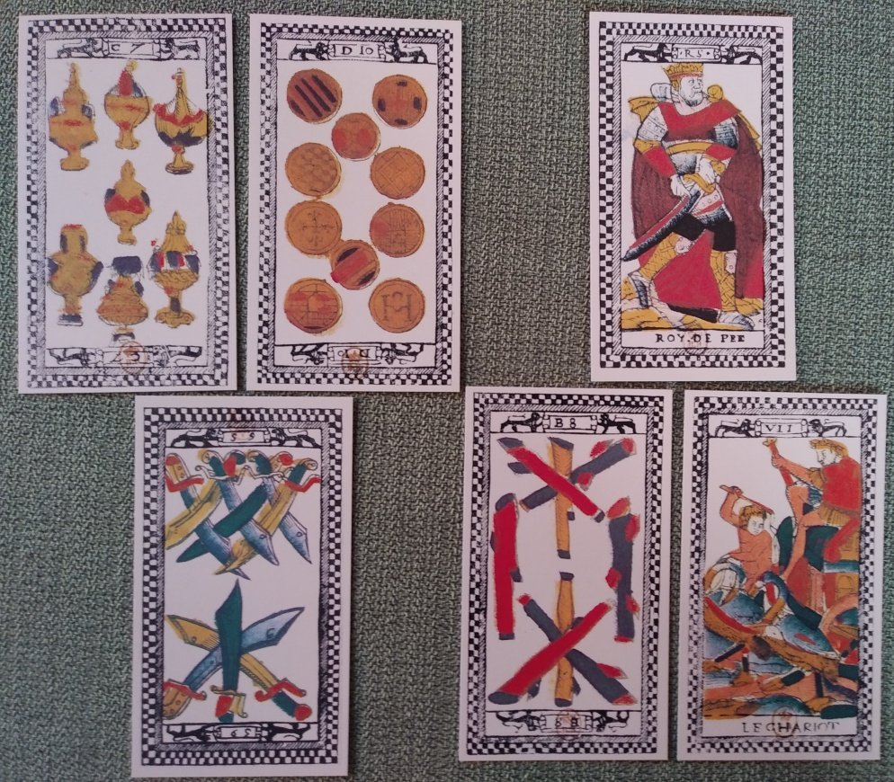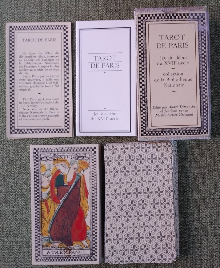 Rachelcat Posted December 24, 2022 Posted December 24, 2022 Happy solstice and all holidays, everyone! My deck this week will be a repeat, the Tarot de Paris. (I used it as a deck of the week once in 2020 and once in 2021.) The title card says “This Tarot pack was made in Paris, in the first half of the 17th century. Now kept in the Bibliotheque Nationale in Paris, it is the earliest known example of the complete pack.” (I have “about 1650” on my collection list, but I’m not sure where I got that date now.) There is a LWB in French. The deck I have was published by Grimaud in 1984. It was new old stock, in other words, a stash of 1984 decks was found in the 2000s, and I grabbed one then. It’s a fun, quirky Marseilles deck with sometimes difficult to make out majors, scimitar-like swords, and club-like batons. Several pip cards have “Facit a Paris par” with the rest left blank, so it’s possible it was designed for several different printers to use. Thus the name; no further printer information is on the cards! On to the interview! How do you feel about me using you as the deck for the Sacred Days of Yule and the last week of 2022? Most important characteristic: 9 d’Espee I’m the only one who will find this deck informative or understandable (9=individual, swords=ideas). Strength: 10 de Deniers The deck’s existence makes the tarot world and tarot lovers (10=group) richer (deniers). Weakness: 7 de Coupes It’s not good for emotional or relationship readings (7=Venus, coupes=emotions). What can you teach me? Le Chariot The deck can teach me how to move forward spiritually and emotionally. Perhaps victoriously. How can I learn it? 8 de Baston Once I understand (8=Mercury) how to go forward, it will happen (baston=energy) quickly! Outcome of our work together this week: Roy d’Espee I will re-master (roy) the art of reading (espee) with pips decks! Sounds good to me! I look forward to it! And now on to my Sacred Days of Yule card!