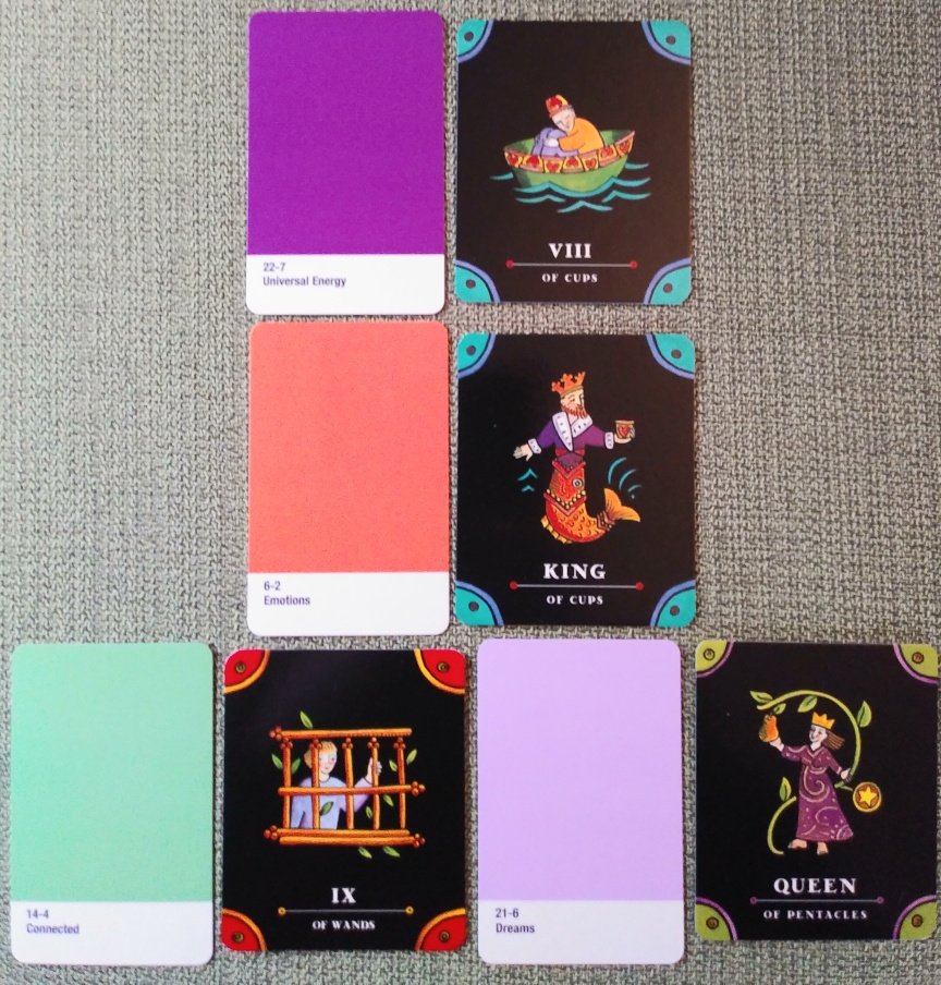 Rachelcat Posted January 14, 2023 Posted January 14, 2023 Hi weekly crew! Good to see you all again! This week I’ve got a cute pair of mini decks. I’ve given away most of my minis because my eyes don’t work as well as they used to, but I’m ready to give these a try! The Tarot: The Complete Kit (3.25 x 2.5 inches) stays in my collection because I love the minimalist, kinda folk art, and the black backgrounds. It’s a “Running Press Miniature Edition,” a cute little impulse buy bait at the bookstore checkout. Back when there were bookstores. I seem to remember someone on Aeclectic saying it is/was also published as Tarot Nova. It has a nice little booklet and a foldout spreadsheet on plain paper. I “needed” a color oracle with keywords, and the little Swatches of Chakra Deck (3.5 x 2.25 inches) fits the bill! It has 25 cards, 3 or 4 for each chakra plus “Limitless.” It’s by the same creator/artist as last week’s oracle (Signs of the Times Oracle), Krystal Banner. (The Prism Oracle did nothing for me, maybe because it was trying too hard or something?) Swatches has a QR code on the back that links to a pdf guidebook with brief chakra info. A short interview this time because there are only 25 cards in the oracle. Strengths: Dreams, Queen of Pentacles The decks are a way of accessing my intuition (6th chakra, queen) by physical means (pentacles). The tarot encourages growth (pear on the branch). Weaknesses: Connected, IX of Wands The decks aren’t very helpful for reading about relationships, romantic or otherwise (green 4th chakra). The person in the 9 of Wands has put her energy (wands) into protecting herself by building a barrier between herself and others. What can I learn from them: Emotions, King of Cups I can learn that emotions are literally visceral, in the 2nd chakra. It looks like the king is being swallowed by a matching orange fish, but he’s trying to stay in control (king) of his cup of emotions without being overwhelmed by the more physical energies of the fish. This certainly an appropriate pair! Outcome of our work together: Universal Energy, VIII of Cups Emotions (cups) can be elevated to a more spiritual level (7th chakra) by taking time to consider and meditate on them (8=Mercury). One of the cups is on his head! He’s not out to sea, he’s taking time out from distractions to understand himself. Wow, these decks seem to work together well! We’ll see the rest of this week!