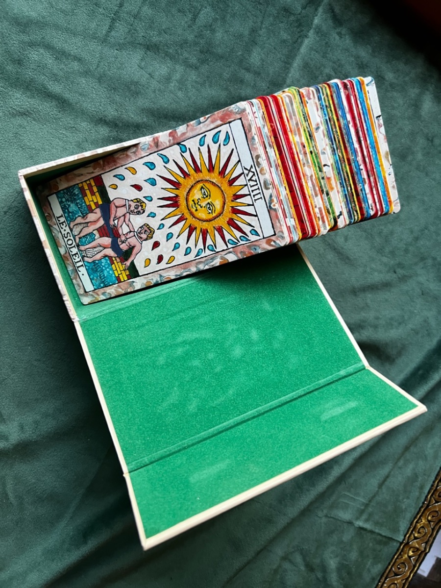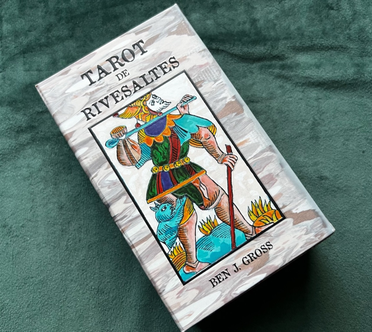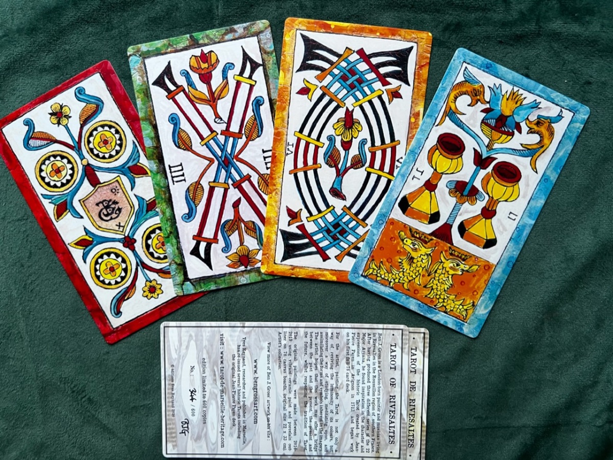 BradGad Posted February 3, 2023 Posted February 3, 2023 (edited) It's Ben Gross's Tarot de Rivesaltes, based on the Pierre Payan 1713 deck. The paintings were made with ceramic paint and porcelin on canvas. The image on the box with has a ceramic-like texture and lustre, and the black lines are raised. The box is truly deluxe, with a magnetic closure and velvet lining. The colors are so lovely, so rich and varied. The border colors on the minors darken and become more intense as the suit progresses. Pretty pips! The Hermit and The Moon are two of my favorite cards in the deck. The Hermit's robe looks so rich and real and warm, like you could snuggle right into it. The face of The Moon is cooly engaging, and the colors and mosaic-like pattern of the water are captivating. When I first got it, about a week ago, I thought the deck would mostly be for show, but no, she talks! The deck is available from the artist’s site and Tarot Heritage, and there’s a good walkthrough on YouTube. (Don’t see the link on Tarot Heritage right now, but it was there a few hours agao.) Edited February 3, 2023 by BradGad
