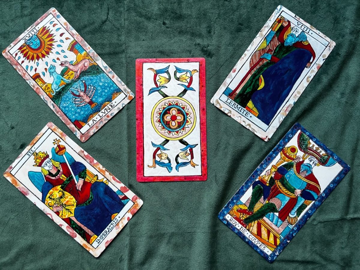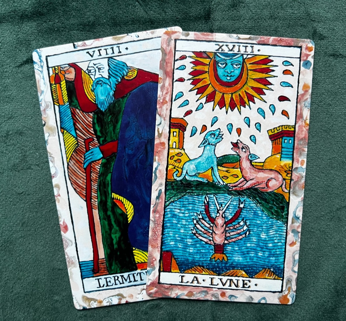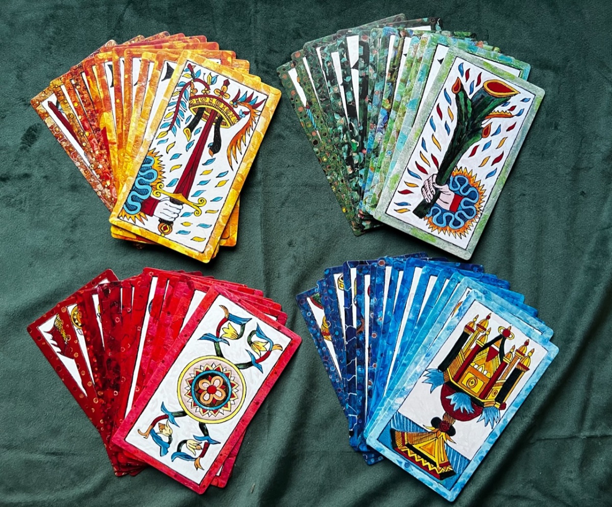 BradGad Posted February 3, 2023 Posted February 3, 2023 (edited) It's Ben Gross's Tarot de Rivesaltes, based on the Pierre Payan 1713 deck. The paintings were made with ceramic paint and porcelin on canvas. The image on the box with has a ceramic-like texture and lustre, and the black lines are raised. The box is truly deluxe, with a magnetic closure and velvet lining. The colors are so lovely, so rich and varied. The border colors on the minors darken and become more intense as the suit progresses. Pretty pips! The Hermit and The Moon are two of my favorite cards in the deck. The Hermit's robe looks so rich and real and warm, like you could snuggle right into it. The face of The Moon is cooly engaging, and the colors and mosaic-like pattern of the water are captivating. When I first got it, about a week ago, I thought the deck would mostly be for show, but no, she talks! The deck is available from the artist’s site and Tarot Heritage, and there’s a good walkthrough on YouTube. (Don’t see the link on Tarot Heritage right now, but it was there a few hours agao.) Edited February 3, 2023 by BradGad