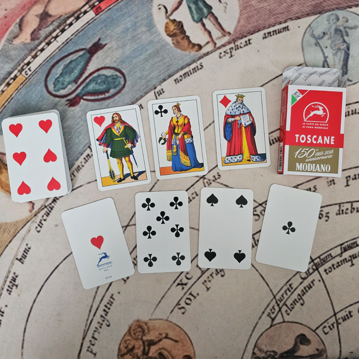 akiva Posted February 5, 2024 Posted February 5, 2024 9 hours ago, Tom said: @akiva I'm not a key word fan either, but I did buy the Tell Me Tarot because I liked the artwork. I usually avoid them, but I think they an help newbies I have the Classic Tarot and I was looking at it today, similar to the Tarot De Marseille but older, It has key words that would be helpful to me that also make it possible to read with reversals (reversed meaning are in the LWB). I have had trouble reading unillustrated pips, it just takes a lot more mental processing. A cluster of cups, sword, etc don't spawn intuitive meanings in my mind. The only tarot I have with keywords is a piedmontese tarot by Dal Negro, but they're in Italian so they don't get in the way! 😆 I also wrote thylbus' keywords on a piquet deck when I was learning his system, as it was quite in depth. It served it's purpose, but I’ve learnt other piquet systems now and having a blank playing card deck is much better for swapping and changing. Keyword decks are great for learning, and they are definitely useful when you're first starting, but after a while they can become a crutch. But as an intro to pip decks, definitely use it until you're comfortable. 😊 This deck arrived today (which I totally forgot I ordered 😅). It's the Toscane regional cards by Modiano, and apparently it's 100% Italy according to the box! 🤣 A 40 card deck, Ace - 7 plus Jack, Queen, King. The court cards are beautiful and the french style pips have no index which is nice. The card stock is thick with little give to the cards. So definitely not a riffling deck!