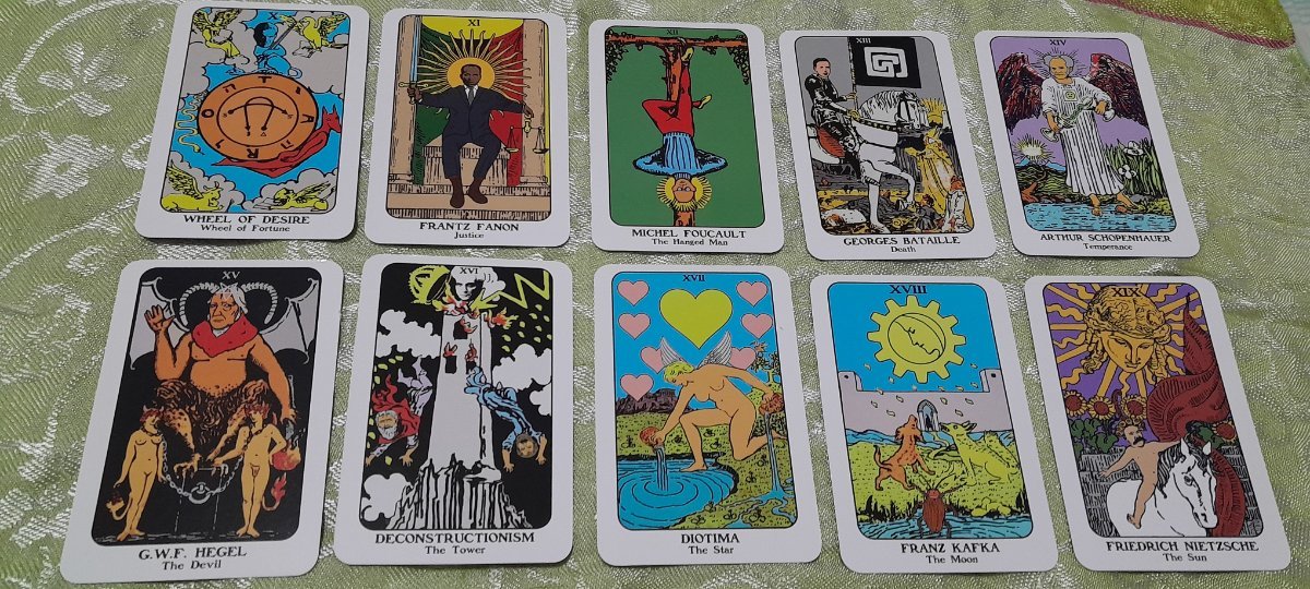 thornapple Posted March 22, 2024 Posted March 22, 2024 i received this as a gift from my brother's ex for a reading i gave her (that essentially boiled down to not taking him back since they discussed the possibility of getting back together after he did something very... bad). i'm surprised she went to this extent for me but it is a good kind of surprise; she's a sweetheart. it's interesting so far. the description on the back of the box says the cards feature popular philosophers, etc. this is most of the major arcana (didn't include judgement and the world due to posting limits): there are some other cards i found very interesting (or comical, as in the case of kafka's metamorphosis being chosen for IX of Swords) i haven't read all of the guidebook yet, but it feels very well-written and would probably be quite appreciated by people with philosophy degrees; even so for people with an understanding of pop culture philosophy, it seems to explain the concepts or the figure well so that you don't get overwhelmed. truthfully, i'm not sure if this is a deck i can read with, but it is a cool and thoughtful gift. my apologies if the image quality is bad, i'm not very good at taking photos 🥲 i just wanted to post about it since this is the first deck gifted to me instead of something i purchased.